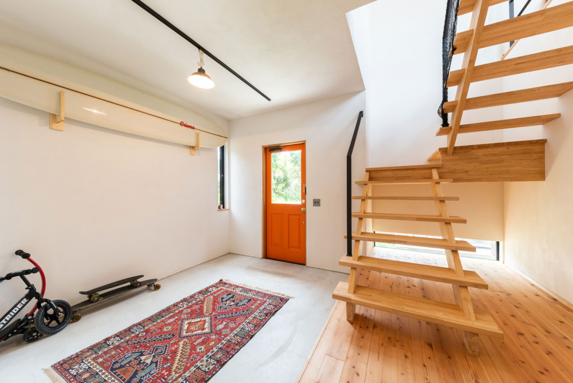 ❷ご主人のご希望で玄関スペースはマリンスポーツなどの用具のために土間に。2階への階段も温かみのある木材を使用して圧迫感のないスケルトンで