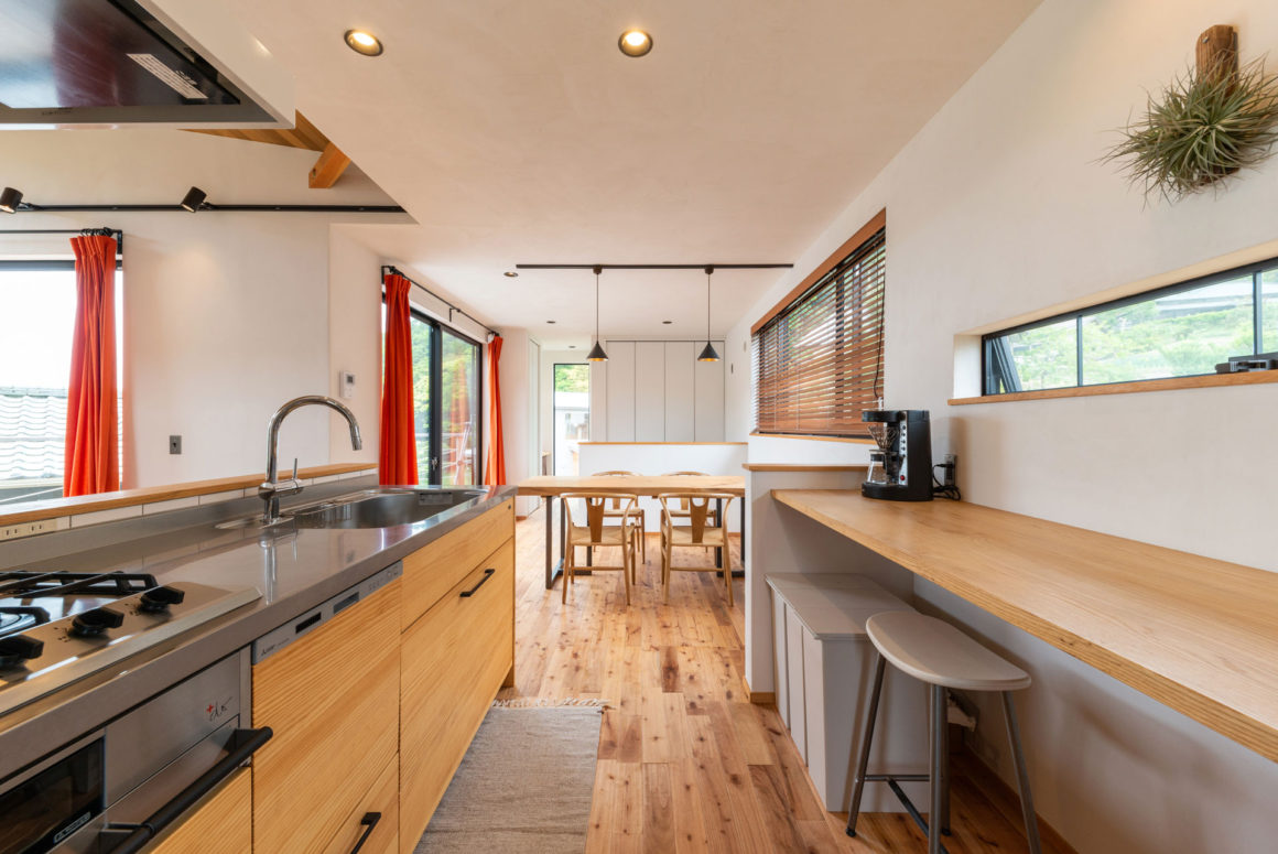 ❼自然素材をふんだんに使用したこともあり、キッチンにもあたたかい木目のシリーズを採用