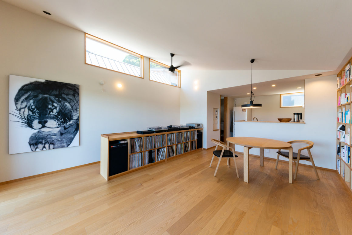 階段側の収納はご主人のレコードコレクション。スピーカーがキレイに収まっているのも造作家具の利点です