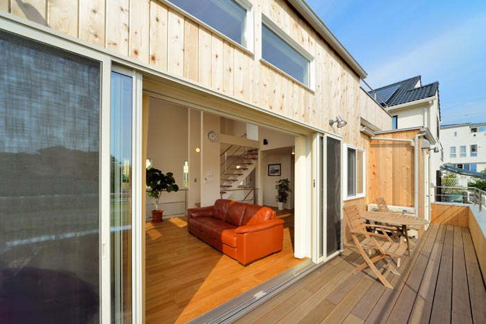 サンセットタイムを楽しむルーフバルコニーもアウトドアリビングとして活用されていました。まさに「陽光を浴びる、レッドシダーの家」なのです。