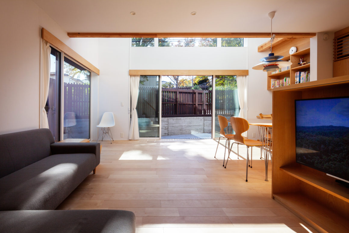 横浜市内の閑静な住宅街。南面で公園と隣接する素晴らしい住環境にシンボリックな佇まいを見せるO様邸。設計上南北に長い敷地をうまく活用するために「光と風」というテーマが浮かび上がります。さらにパッシブな暮らしを楽しむために、家の中全体が暖かくなるよう計画した躯体蓄熱型の床暖房(BEシステム)を用いて健康的な住まいを実現しました。