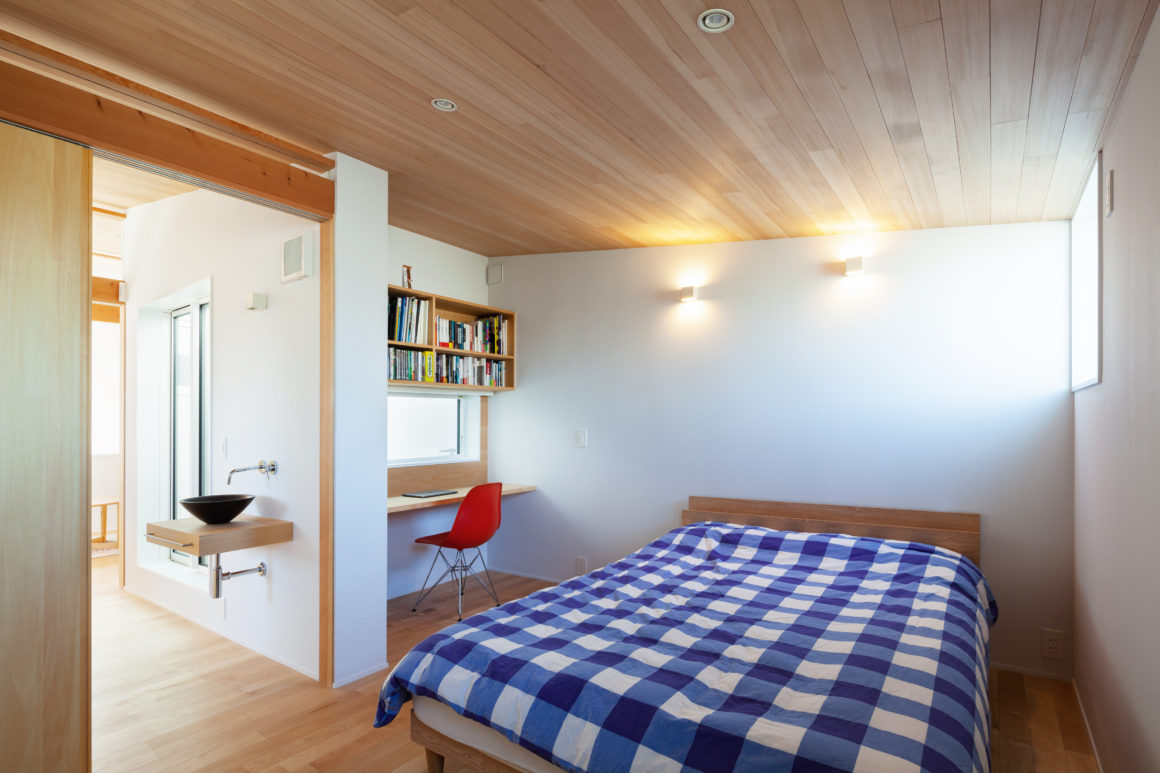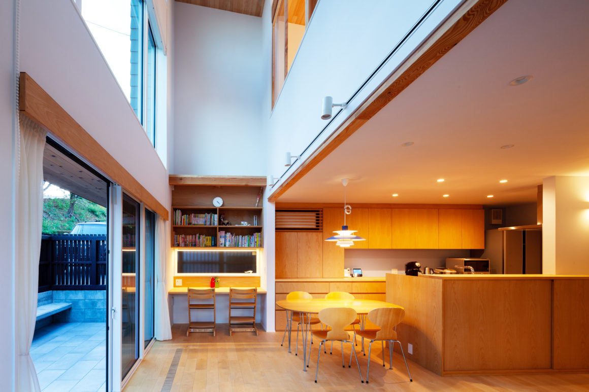 2階はそれぞれの個室とし、南側に吹抜けを設け、日射を1階のLDK奥まで取り込むように計画しました。また子供室となる2階寝室は、吹き抜けに面して室内窓を設け、窓を開けると1階LDKとつながります。