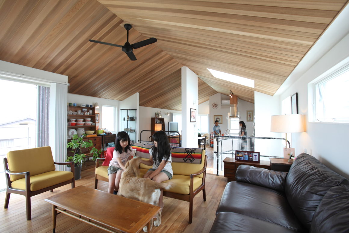 施主のK様ご家族は12年間の米国生活の後ご帰国された。家具やインテリアの多くはアメリカから持ち帰ってきたもの。リビングからステップダウンするダイニングにはアメリカンニューモダンで統一感を演出。こうした施主のライフスタイルや趣味趣向を充分にヒヤリングし具現化した建築家が関わった家は明らかに完成度が違う