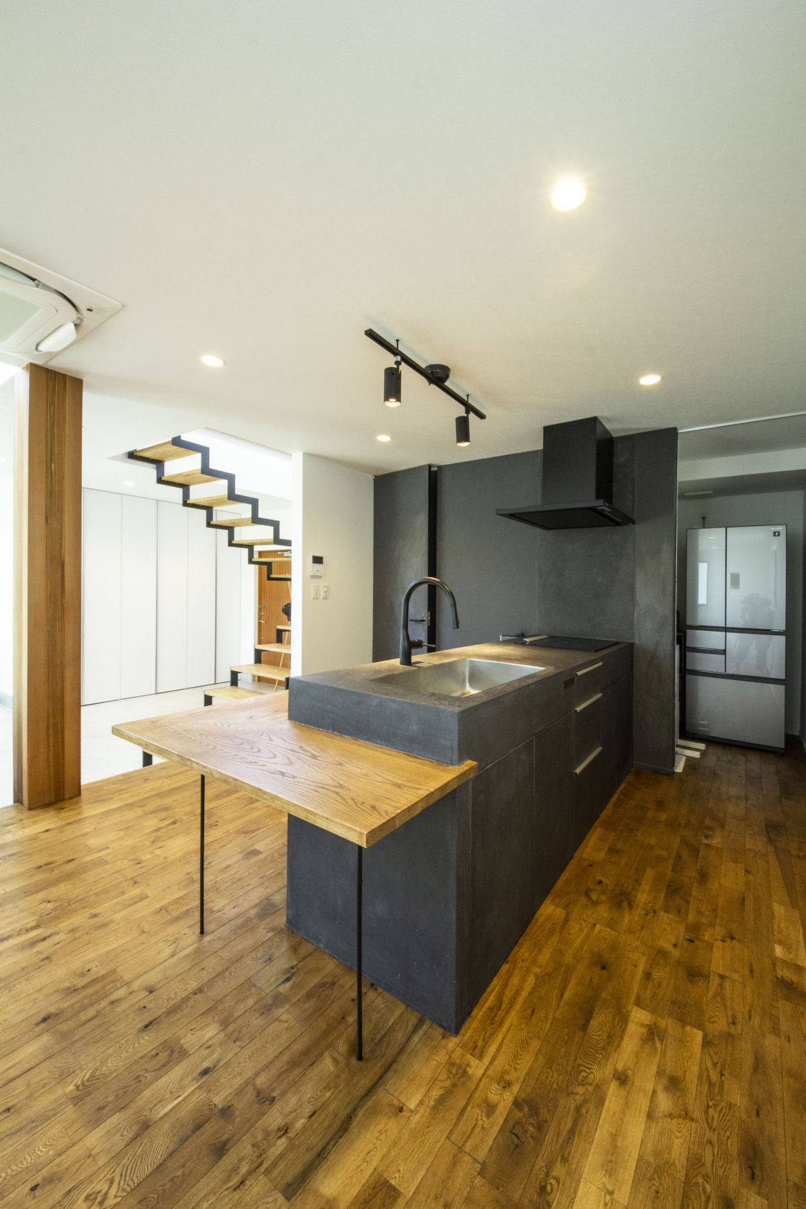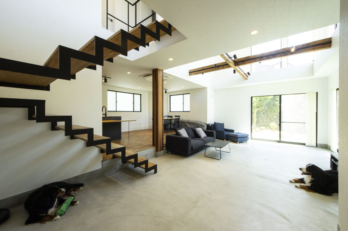 「自分の注文住宅を作ることの難しさも感じました」ともおっしゃるけれど、それほどご自身の入念なイメージを注ぎ込んだともいえるこの住まい。1階のドアを開くと大きなモルタルの土間が半分以上の面積を占めている。それは海外赴任前から一緒に暮らしてきた2頭のバーニーズドッグ「セナ」と「アル」のため。大型犬にとっては夏も冬も過ごしやすくて歩きやすいスペースだから。