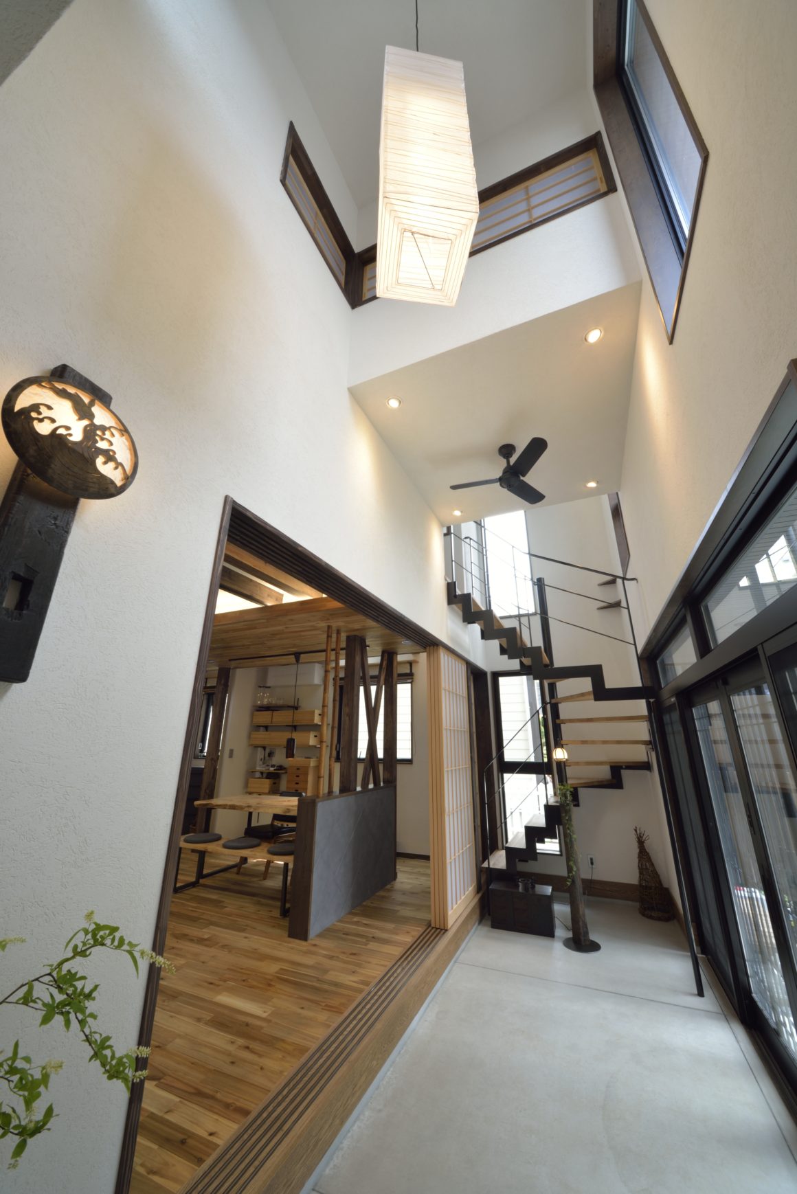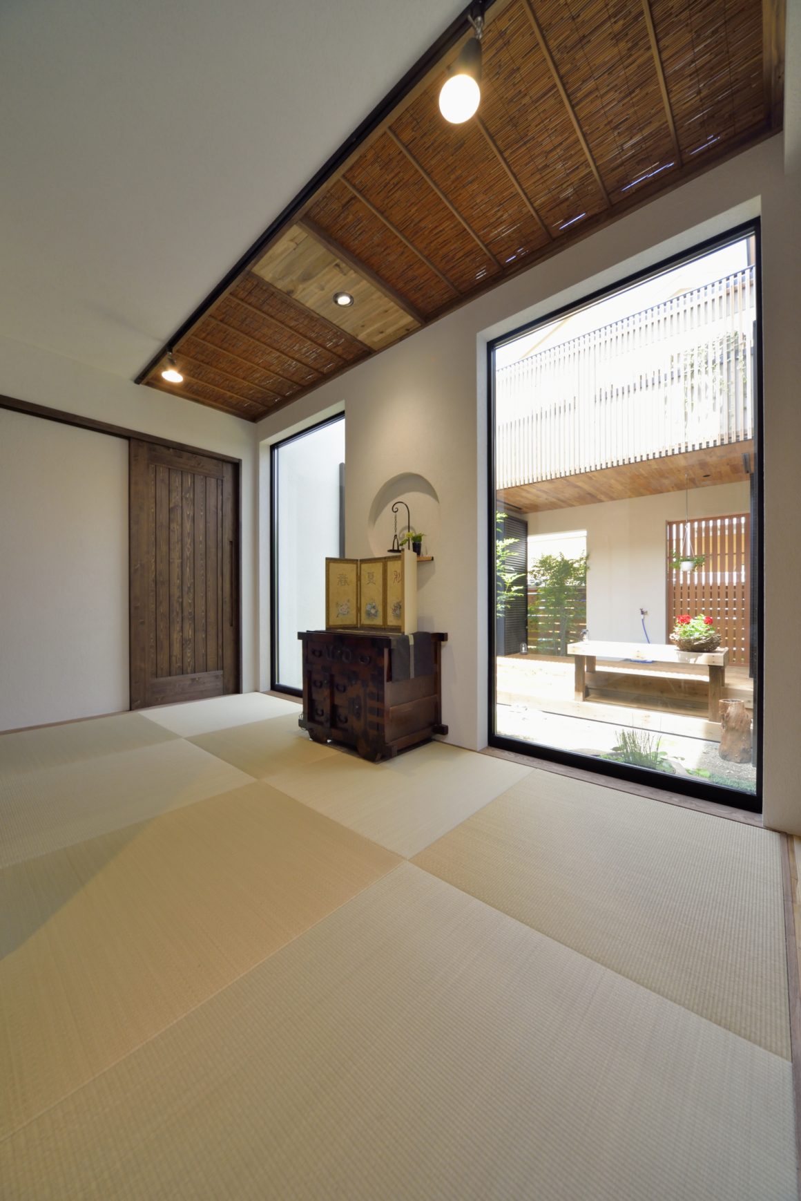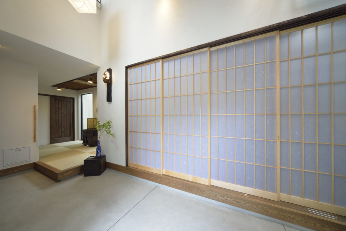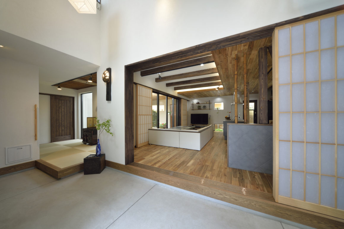 四方を囲まれた敷地に「明るい和モダンの家を」という施主の希望を実現するために、南側を平屋としてより日差しを取り入れ、中庭を中心として各部屋を回廊できるよう開放的にレイアウト。落ち着いた外観から、玄関の土間で驚き、中庭を見てさらに感動を与える、秀逸な住まい。施主のふるさとである新潟の雰囲気を維持するために、木と自然素材はふんだんに利用しています。