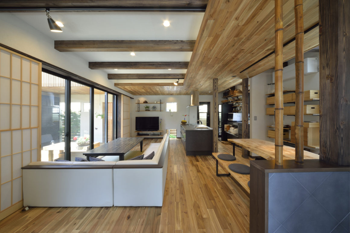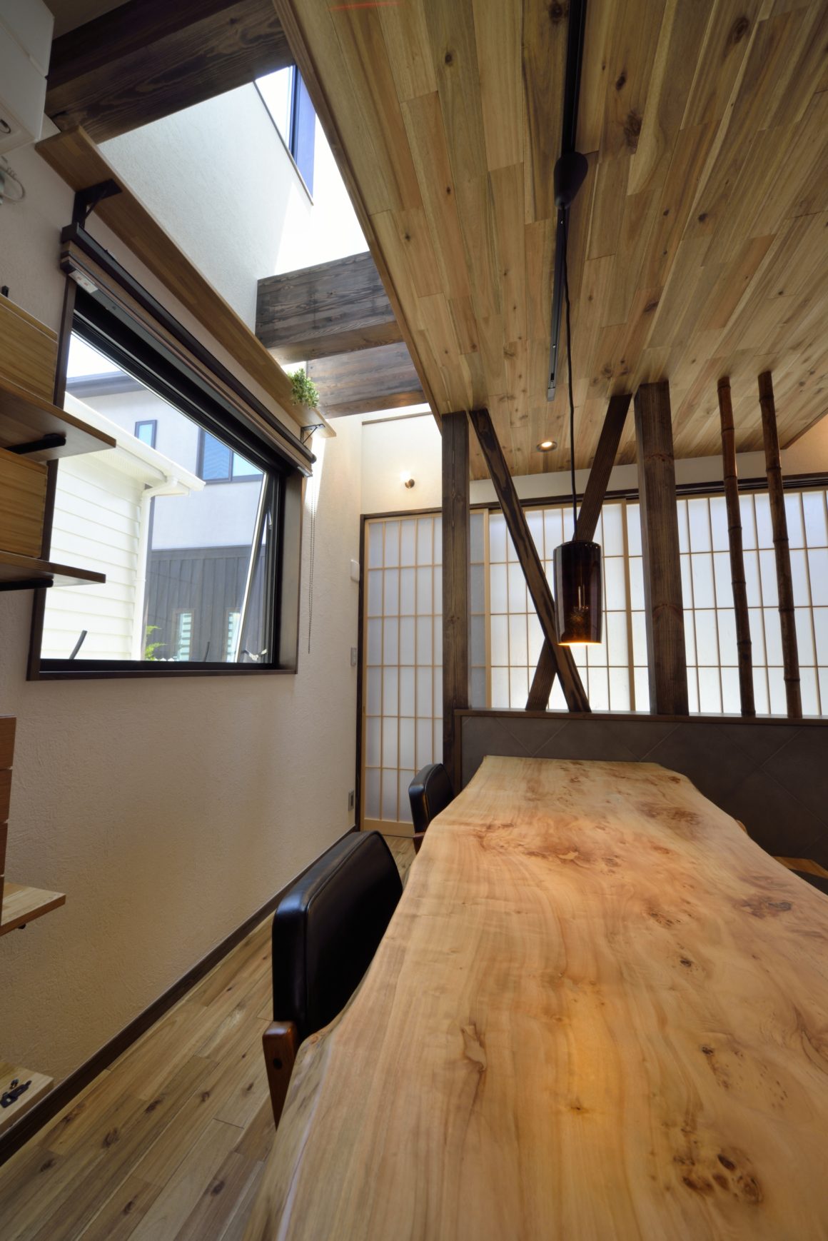 室内はご家族のふるさと新潟の雰囲気を出すためにアカシアの無垢材や自然素材をふんだんに使用し、囲まれた環境の中で、各所で光を採用する工夫を設けたことで、明るく風通しの良い住まいとなりました。