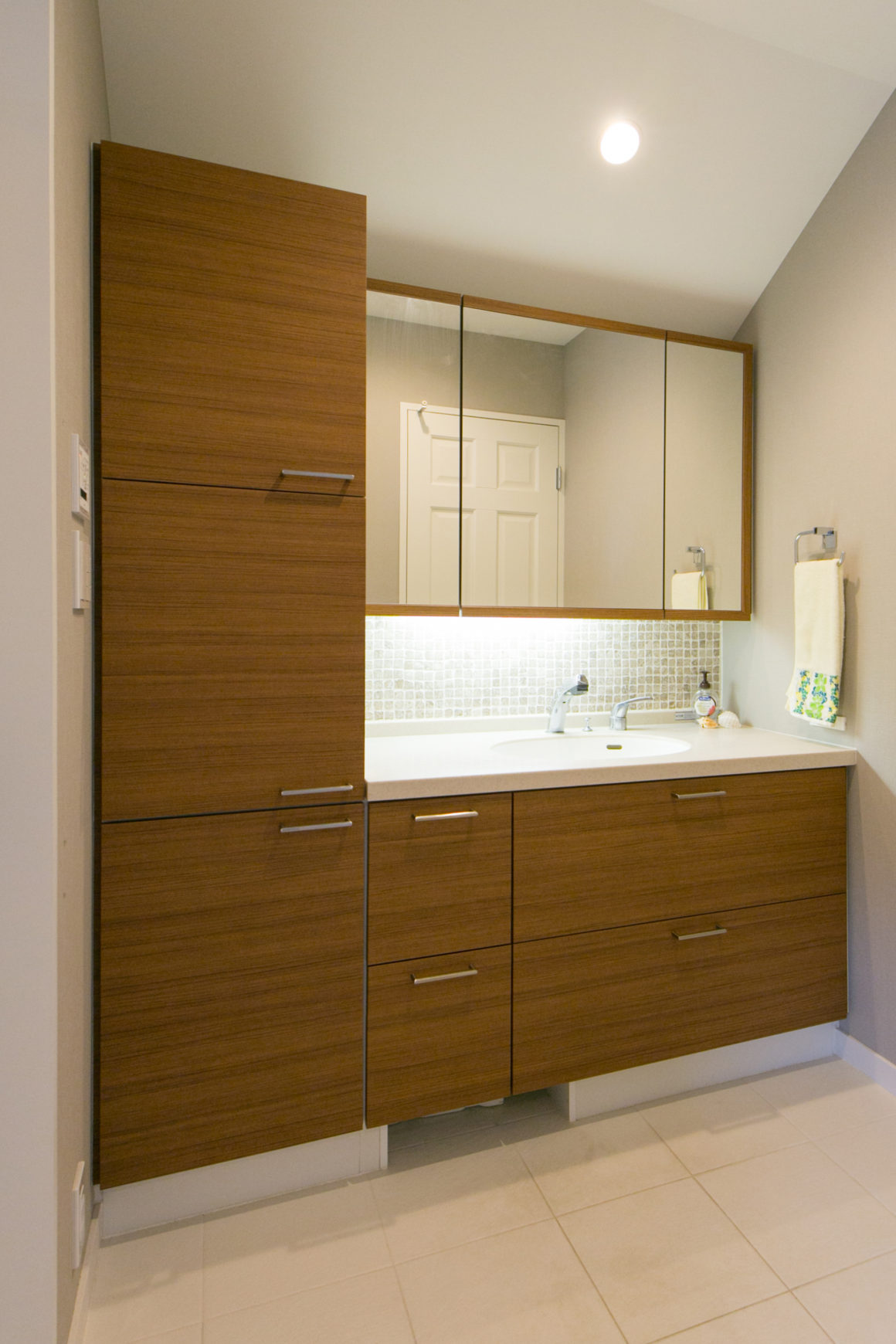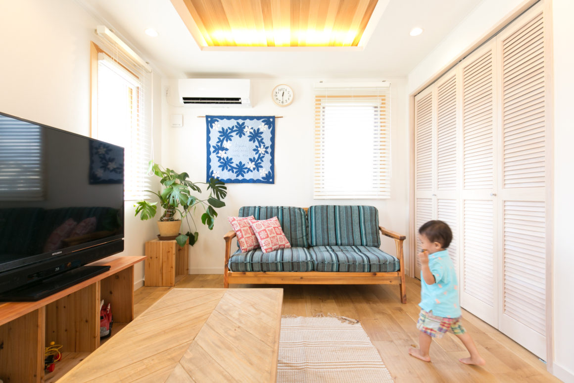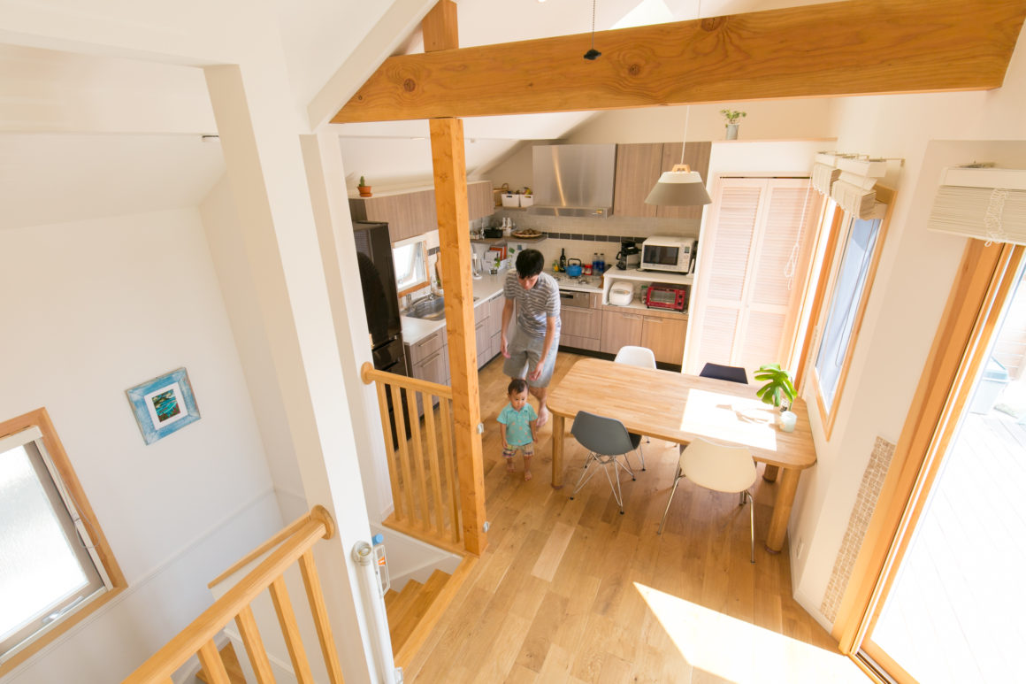 トリプルガラスの北欧木製サッシや蓄熱式床暖房をご採用頂いた高気密・高断熱住宅です。リビングダイニングからつながるウッドバルコニーやロフトへ繋がる吹抜け部分には天窓も配置してより開放感が感じられる空間に。梁をそのまま見せたり、無垢フローリングを採用するなど自然素材を取り入れながら、アメリカから輸入したシーリングファンなど小物でリゾート感を演出。キッチンタイルやトイレ・階段室など小さな空間にも色やデザインで遊びをいれることでこだわりの空間ができあがりました。