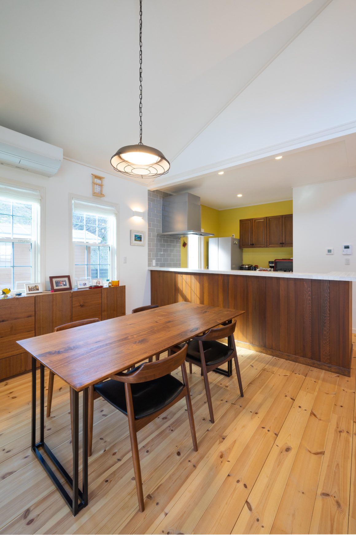 住まいは220坪に敷地に建つ平屋。大きな勾配天井におさめられたリビング・ダイニング。居室は独立した子供たちの大家族が集まっても大丈夫なようにベッドルームが3つ。広い庭の芝生はNさんが自ら手を入れたもの。愛犬には最高のドッグランだ。敷地の西側には母屋の外観に合わせて並んで建てたログの小屋がある。ここは遊び道具を詰め込んだご自慢の作業場だ