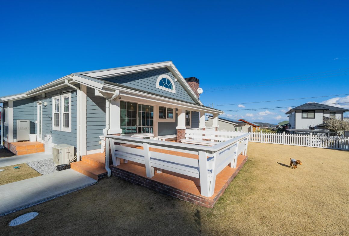 ラップサイディングの外壁に大きな煙突、広い芝生と大きなカバードポーチ。まさにアメリカのカントリーライフがよく似合うN邸は雄大な房総半島、御宿台に建つ。セミリタイヤしたNさんにとってはやりたかった男のロマンが詰まった住処だ