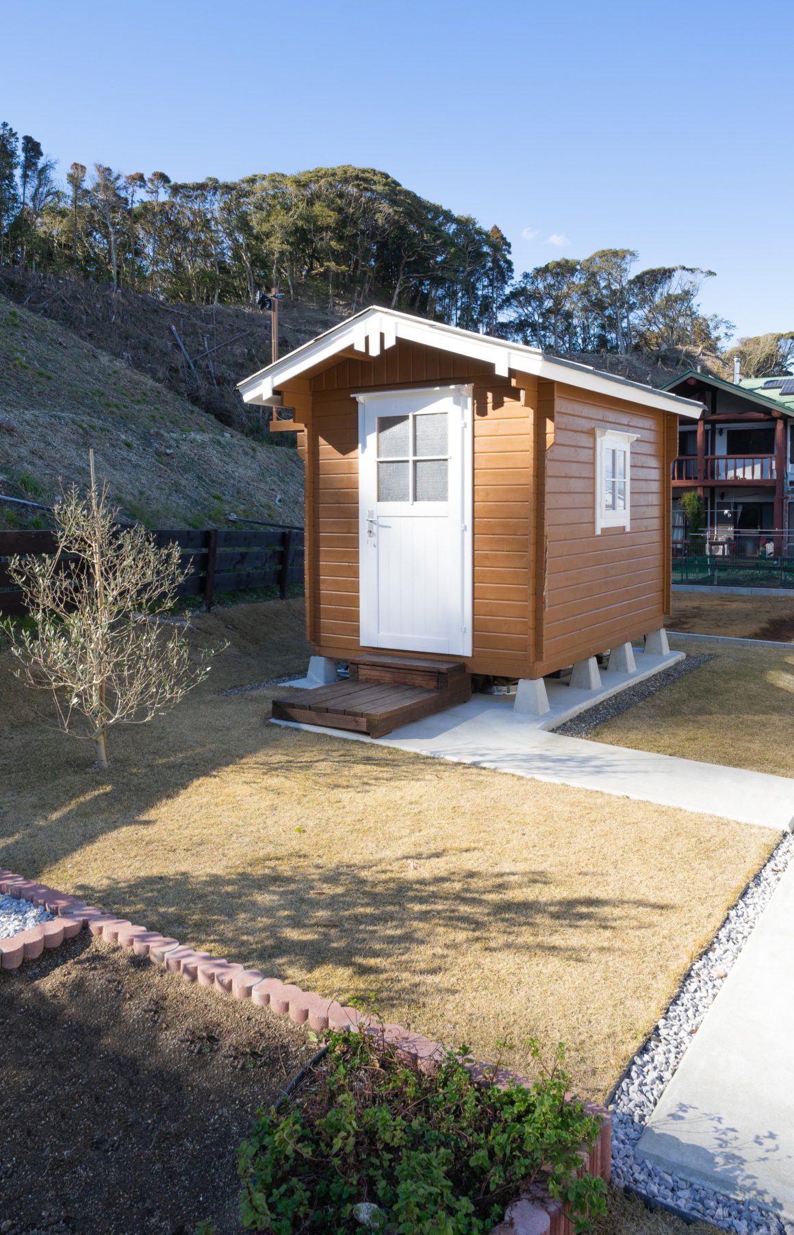 くだんの通り、住まいは長く過ごした南カリフォルニアの住宅を再現したもの。アメリカンなラップサイディングの外観と大きなカバードポーチ、外シャワー、室内には薪ストーブ。遊び道具は屋外の自作の小屋に収めてある。