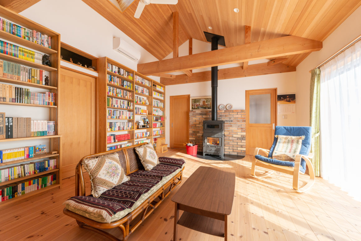 薪ストーブのあるリビングの椅子に腰掛けて読書を楽しむ。静かな空間にささやく鳥の声、吹き抜ける風。天井の高い、広々としたリビング&ダイニングから丁寧に手入れされた庭をながめる。Yさんにとってほっとする時間、安らぐ空間となっている。