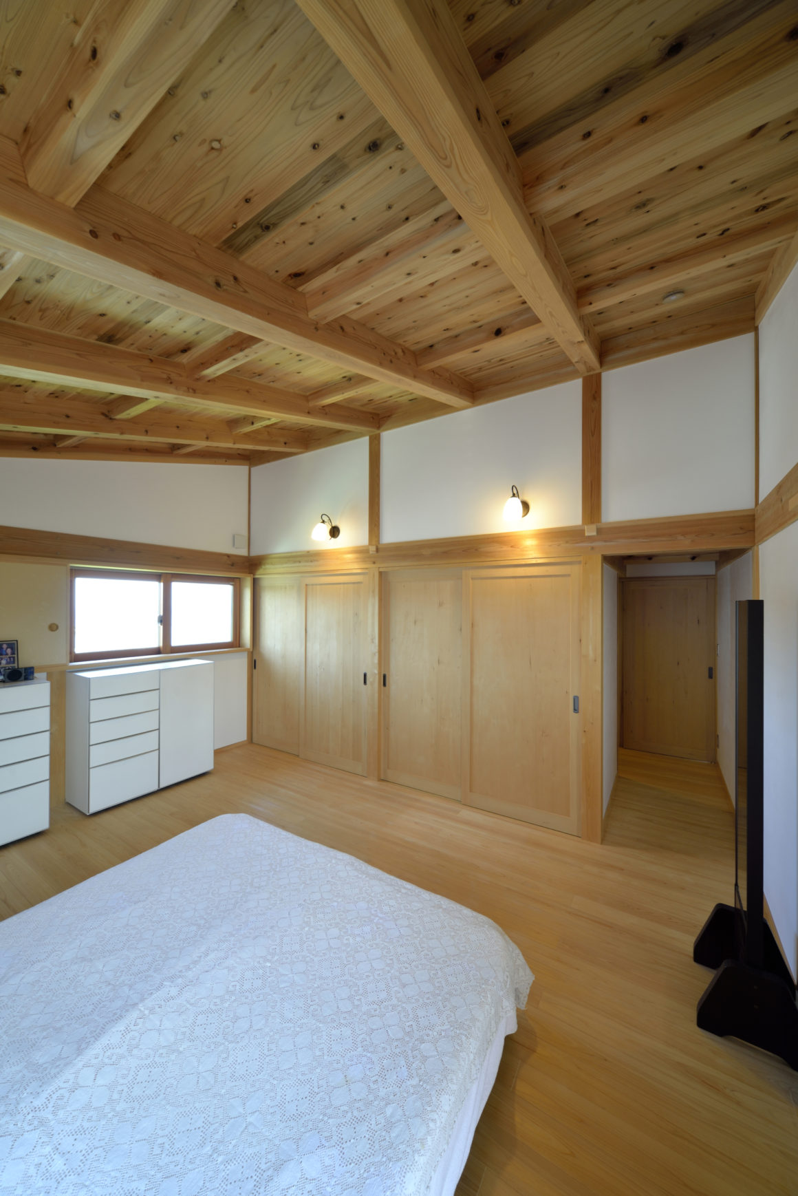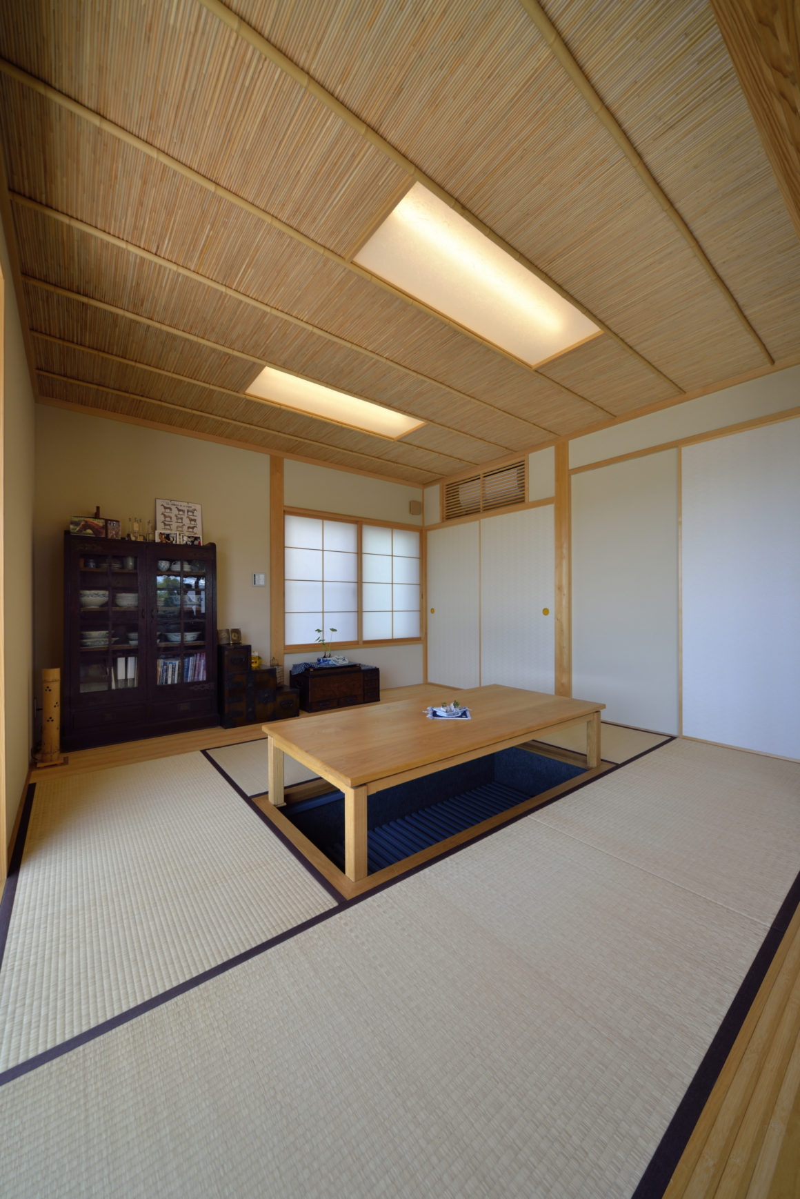 天井/桧板張り、サツマ葦合板張り、環境壁紙貼り、杉ムクパネル現し