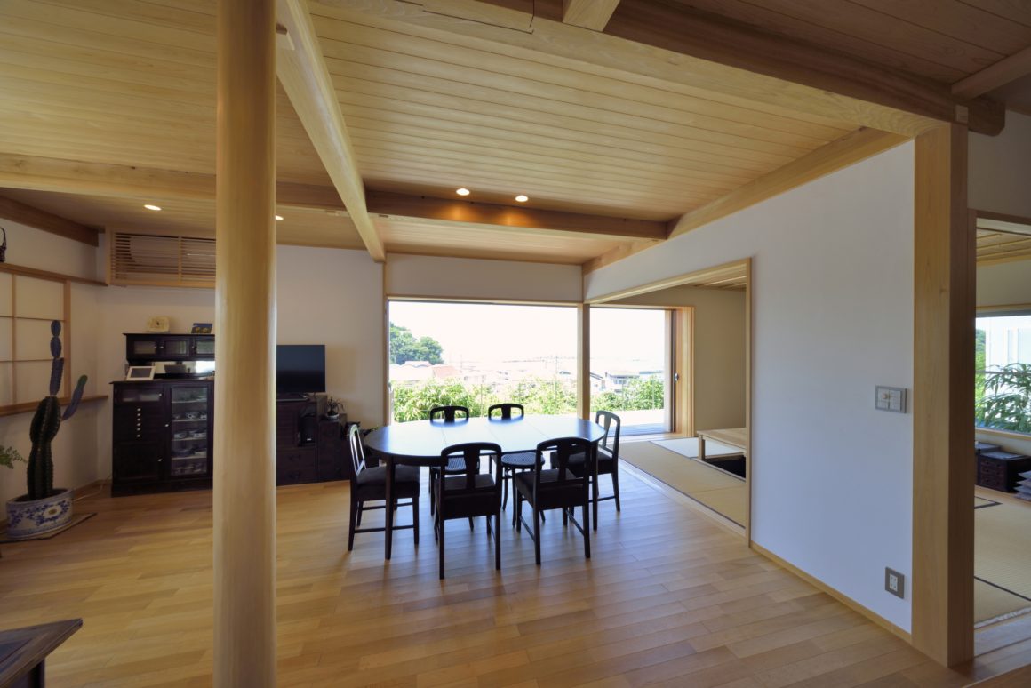敷地は海辺から少し上った西下がりの台地で、相模湾、伊豆半島、そして富士山を望むことができます。当初はより眺望の期待できる2階にリビングを設けるつもりでしたが、長閑な場所にもかかわらず準防火地域ということで、2階は窓が全開できないどころか網入りガラスになってしまうことが判明。そこでリビングを1階にした上で、延焼ラインを避ける絶妙な位置にメインの開口部を設けました。また自然エネルギーの最大活用を目指して、太陽光発電パネルと太陽熱温水器を搭載。発電効率を考えて屋根をいつもより急な5寸勾配に設定したため、建物はかなり背の高い印象になりましたが、素材、仕様など細部のこだわりにも注目です。