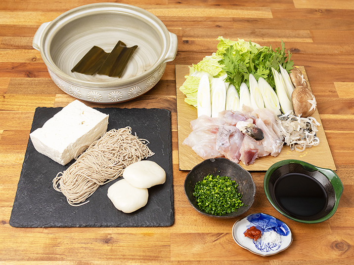 築地⿂政の天然とらふぐ(⾝、アラ、⽪)、吹田商店の熟成利尻昆布、杉寅の豆腐など、築地の老舗店が厳選した食材を使用。受取日は2021年12月~2022年1月の土曜日を予定。2月からは新メニューに。
