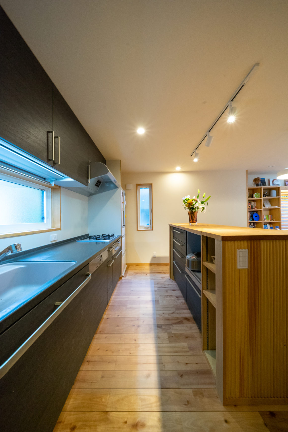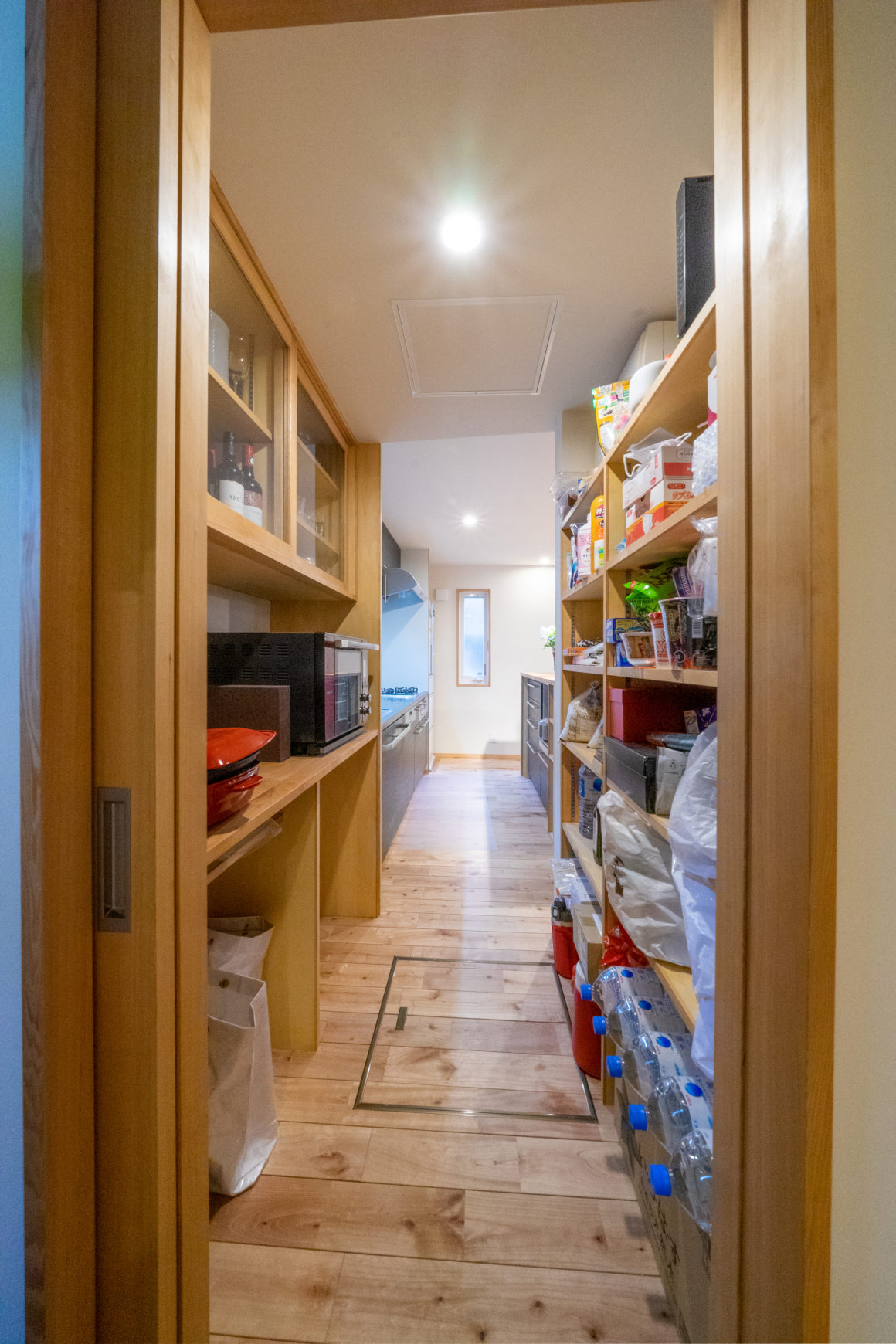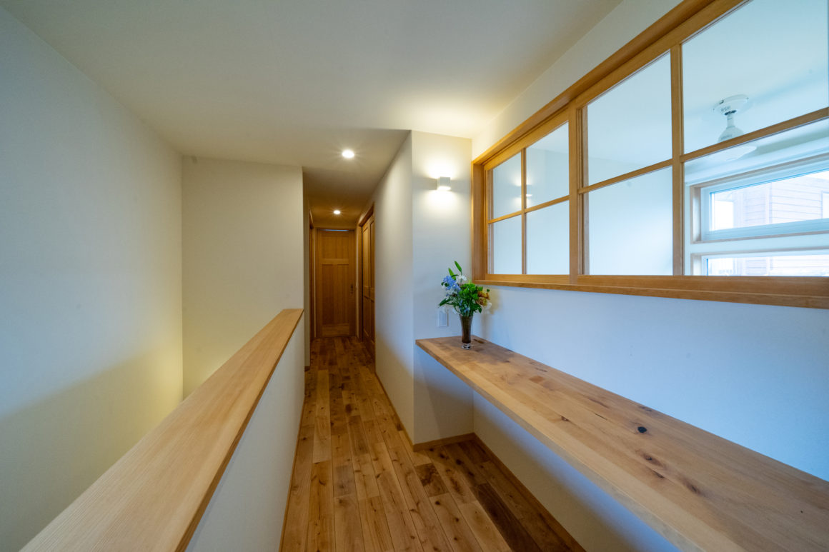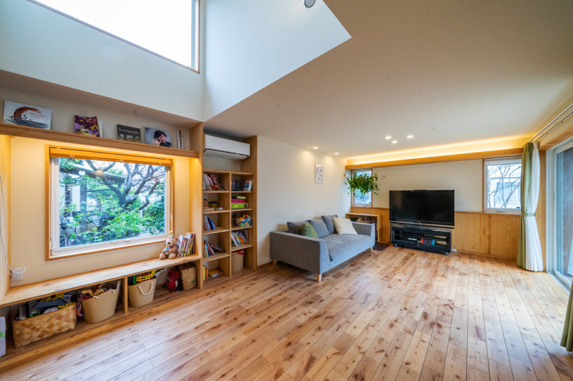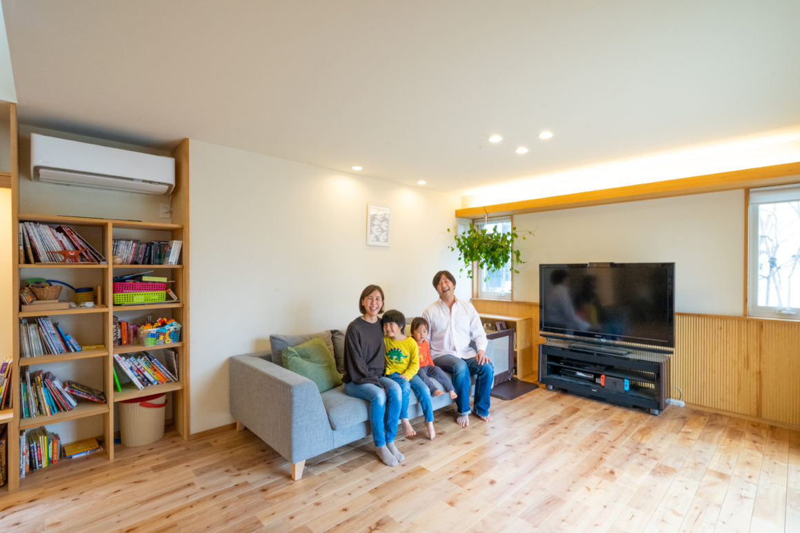 ふたりの小さなお子さまは、少し硬めのカバザクラを採用した床でゴロゴロと遊んでいる。リビングはかけっこができるほど広くおよそ27畳もあるそうだ。家のどこにいても木の香りが漂うほど。白い壁とのコンビネーションが目に優しく、ご家族の心の落ち着きを招いているのだろう。