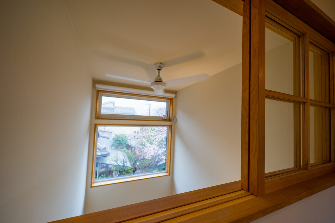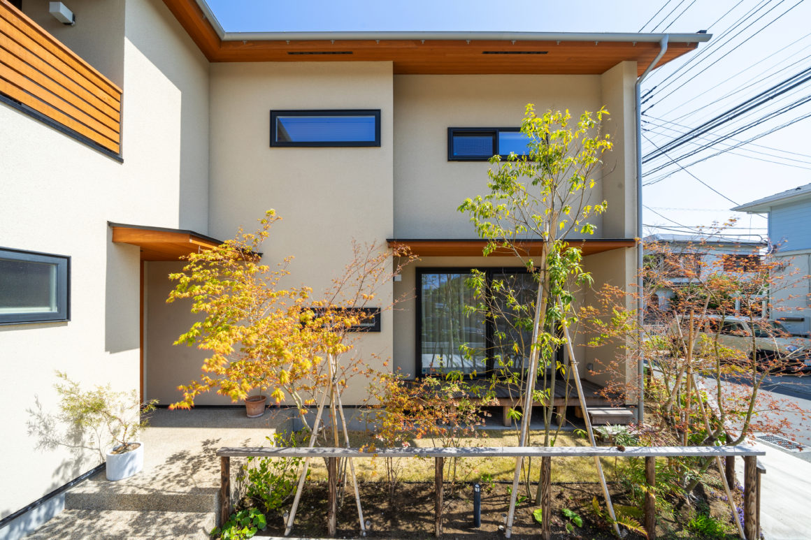 K様のご要望は子供たちが走り廻れる広いリビンングでした。吹抜やデスクスペース、子供用の出窓付図書スペースなどを設け表情豊かな空間としました。敷地は住宅街ではあるが車や人の通りも多いため、中・高木樹木をバランスよく植えることで庭と通りとを緩やかに繋ぐ計画としました。通りの人からも『素敵な植栽ですね』とよく声を掛けられるとのことで、うまく街並みに馴染んだようで安心しています。