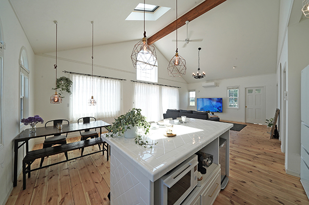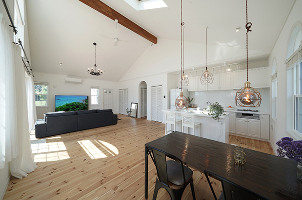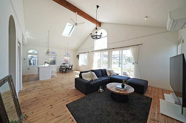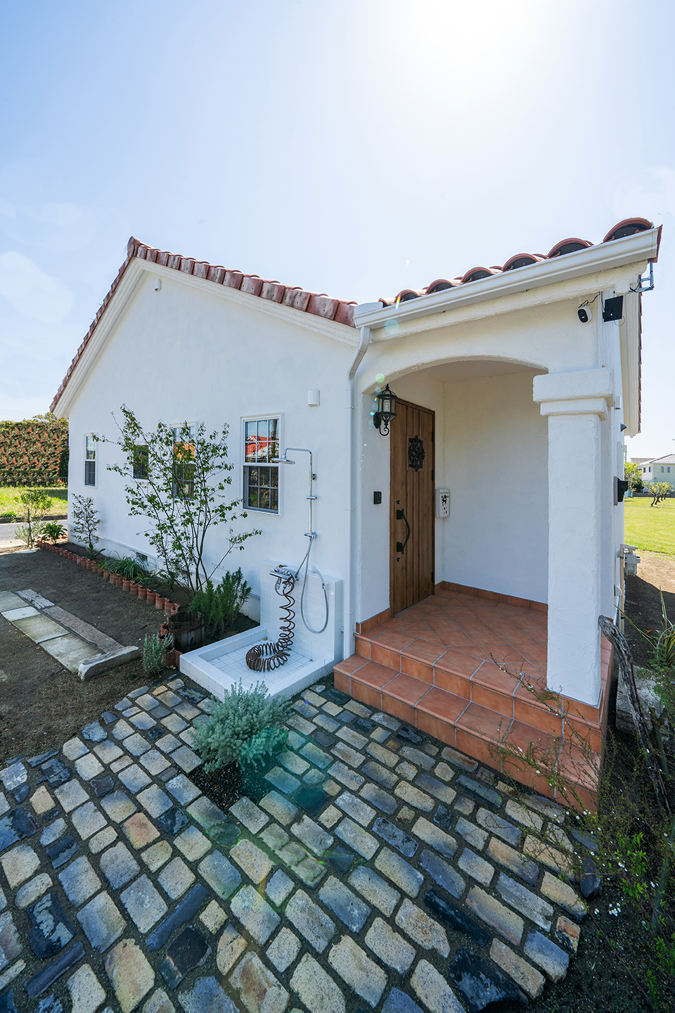 ふたりだけの暮らしはコンパクトだから住まいは最小限でいい。広いエントランスに隣接して大きな土間をつくったのはサーフボードやキャンプ用品スポーツ用品を収納できるから。そして海から戻って外シャワーを浴びてバスルームへ直行できるサーファー動線もテッパンだろう。大きなリビングと最小限の寝室、大きな屋根裏収納が有効だそうで、これだけの要素は南欧風輸入住宅の平屋でおさまった。