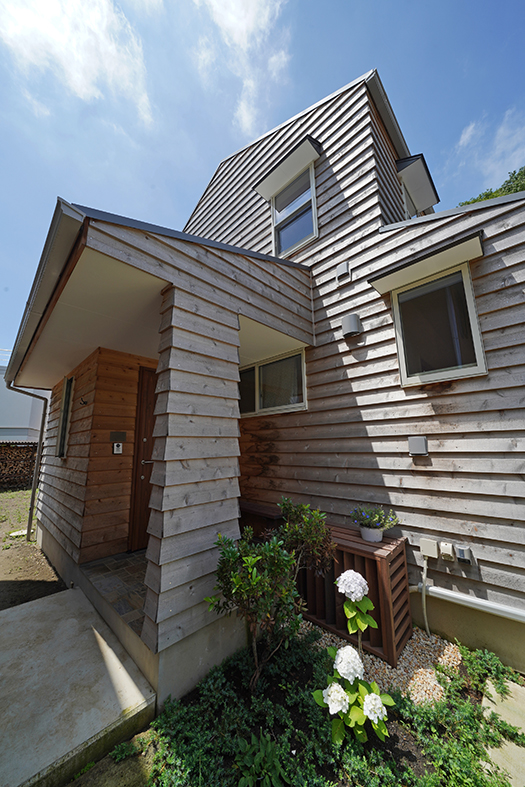 山側の傾斜地に建つM邸。そのファサードの真ん中、木の扉は奥様の夢だった焼き菓子のお店「ルリビタキ」の入り口だ。乾いた風、青空、潮騒、そんな湘南の自然環境にいちばん似合うのはアメリカ西海岸で採用されるウエスタンレッドシダー(米杉)のサイディングだろう。時間の経過とともにシルバーグレーに輝いていく端正な表情は湘南住宅のテッパンのひとつ。