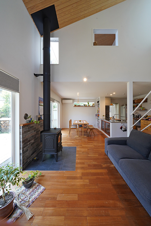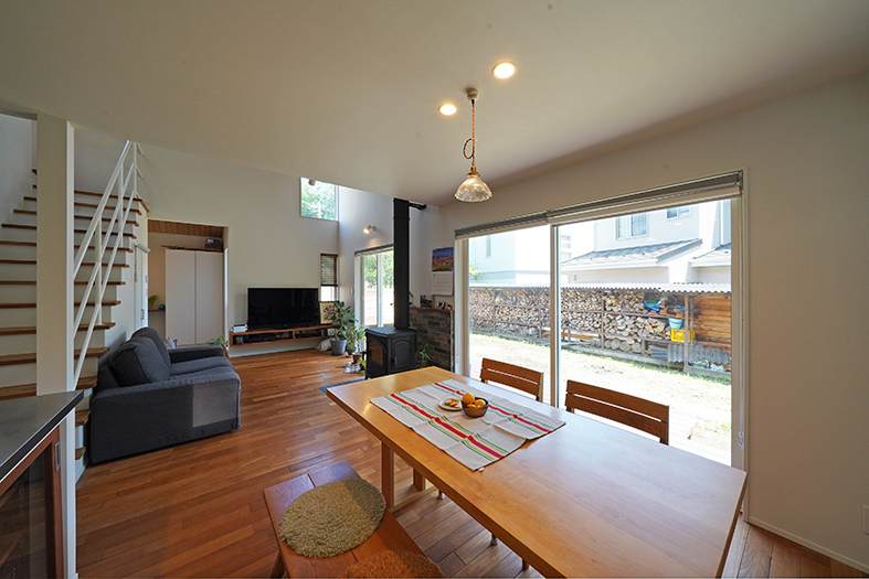 室内に目を向けると、ツーバーフォー工法を採用しエントランスの大きな吹き抜けが開放感をつくり出している。リビングには薪ストーブ、庭にはたっぷりと積まれた薪。無垢の床材に白い壁。
