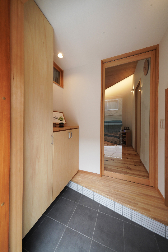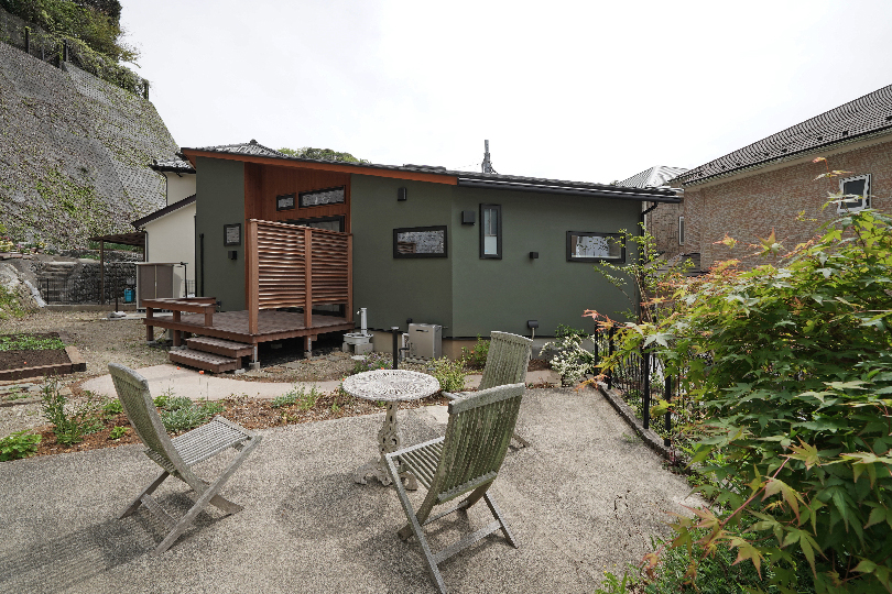 周囲の環境にも配慮して、外壁は濃い緑を採用。落ち着いたアースカラーは心を穏やかに保ってくれます。室内も木をふんだんに採用していて白い漆喰クロスとの相性も良好です。