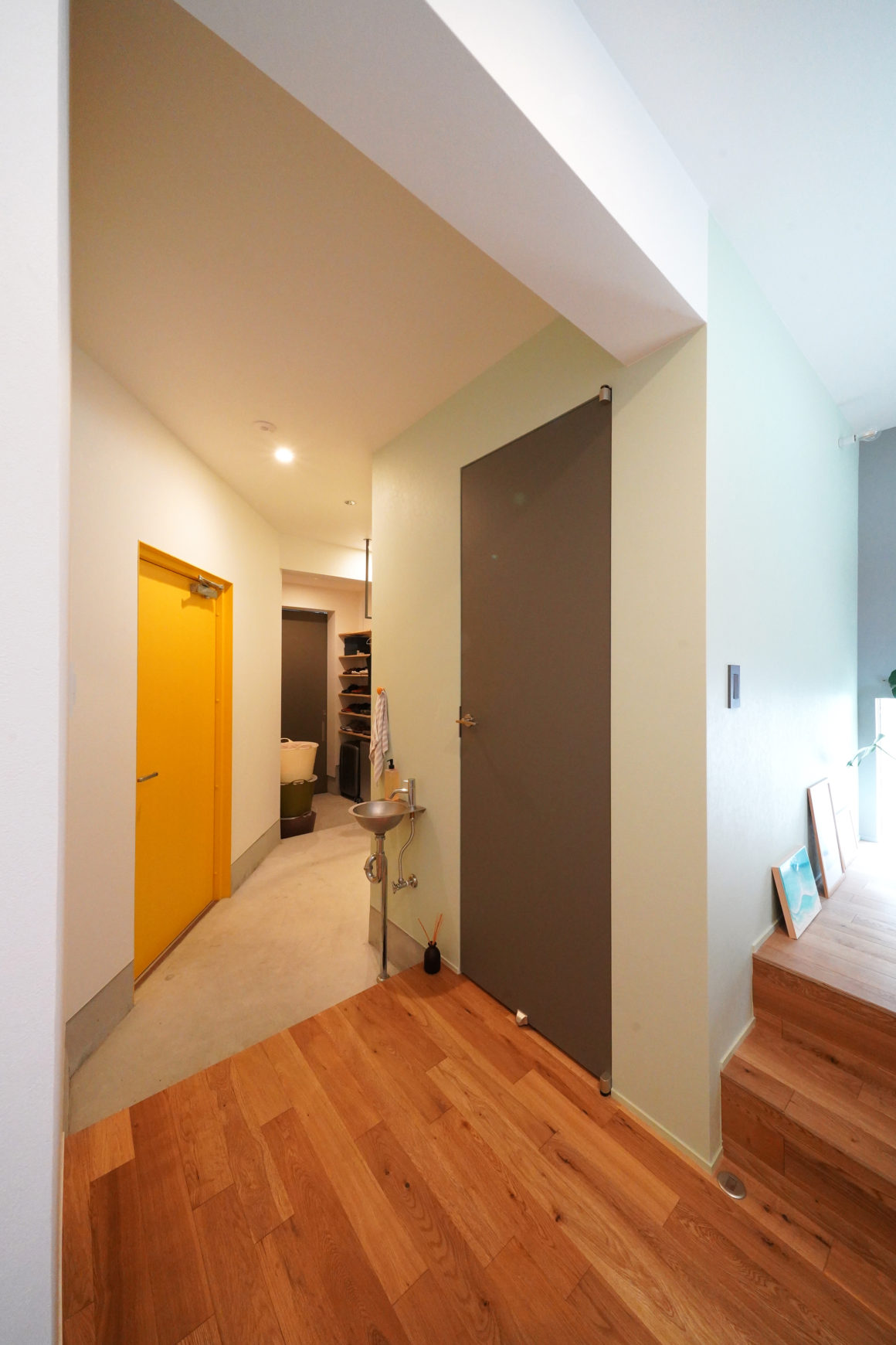 機関士として長い航海に出るご主人には長い休暇もある。海からあがって葉山で暮らす期間はサーフィンやSUPなどを楽しんでいて、ほとんど毎日海で過ごす。機能的な室内設計やアイデアは満点として、外壁や玄関ドア、タイルなどにカラフルな色彩を採用してさらにポイントがアップする楽しいお家だ。