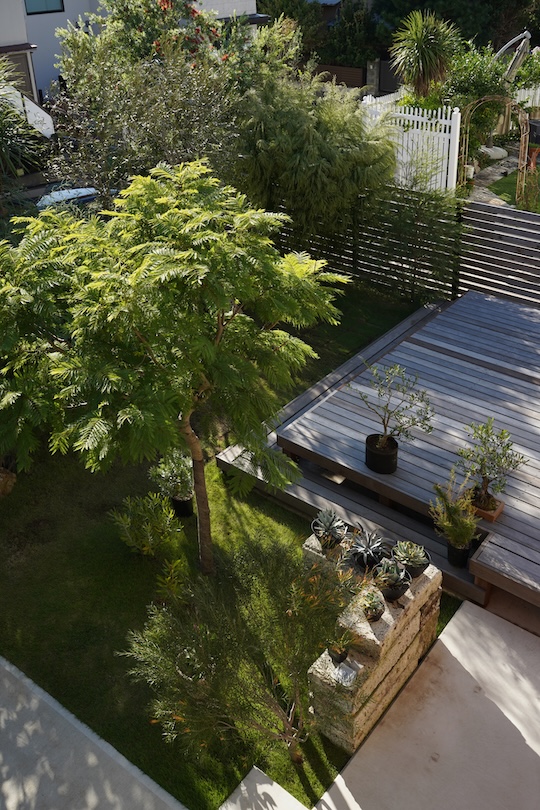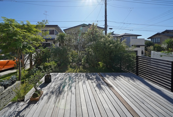 庭に目をやると、手すりのないインフィニティなウッドデッキが広がる。これはご主人がご自身で完成させたという。通り側にフェンスを設けず、低い目線の先には南半球のオージープランツが逞しく育ち日常生活を遮ってくれている。この庭とレッドシダーの建物のコラボレーションは新しい湘南のスタンダードのように見えた。