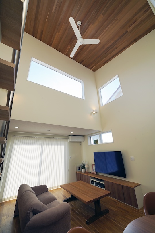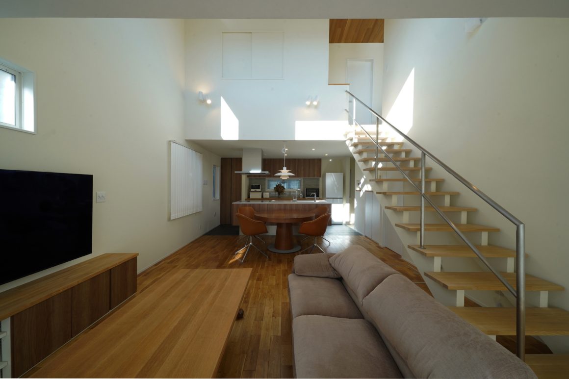 まだ古家が建っていたこの場所で、2階のバルコニーからは水平線が見えると推測され、1階と2階リビングと2つのプランができ上がったのだが、結果として大きな吹き抜けを構えた1階リビング案が採択されることになった。南面のはめ殺しのハイサッシからは溢れんばかり陽光が降り注いで明るくて暖かい空間だ。