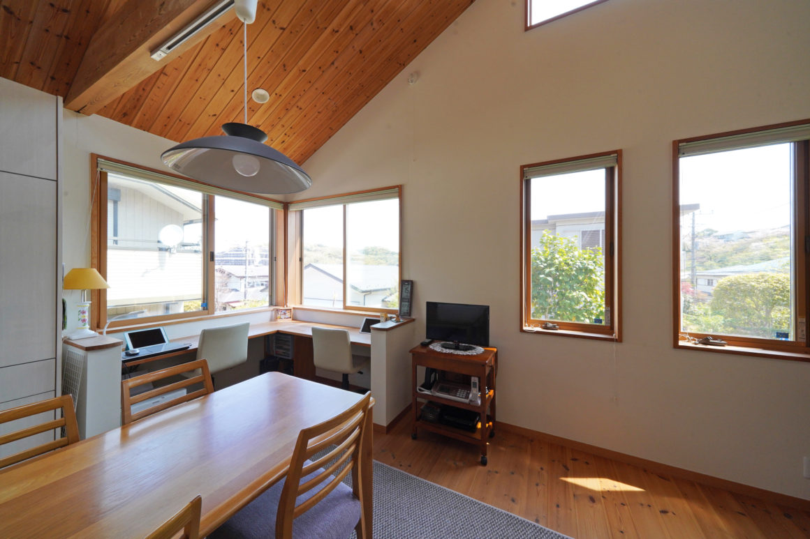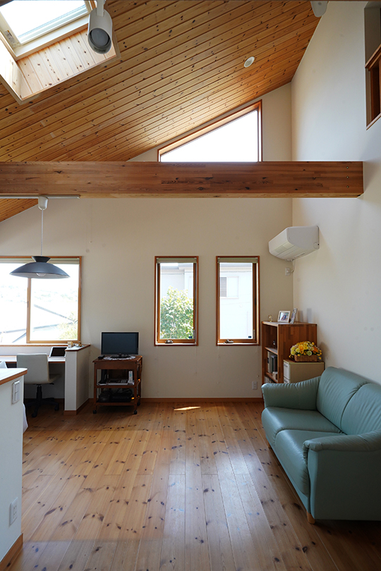 「私はいつもこの席に座るのですが、ここから山桜も見えるし紅葉も楽しめます。時にはずっと木の天井を見上げています。天窓からは月も見えるし、夜中にキッチンの壁に月明かりがさしています。まるで自然とともに住んでいるようです」と奥様。