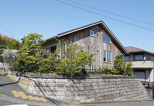 高台の東南角地で目の前を遮るものがない土地の魅力を生かした開放的な佇まいに映えるウッドサイディング。室内も木の魅力にあふれて「新建材にはない木の温かみを感じています」とご主人。