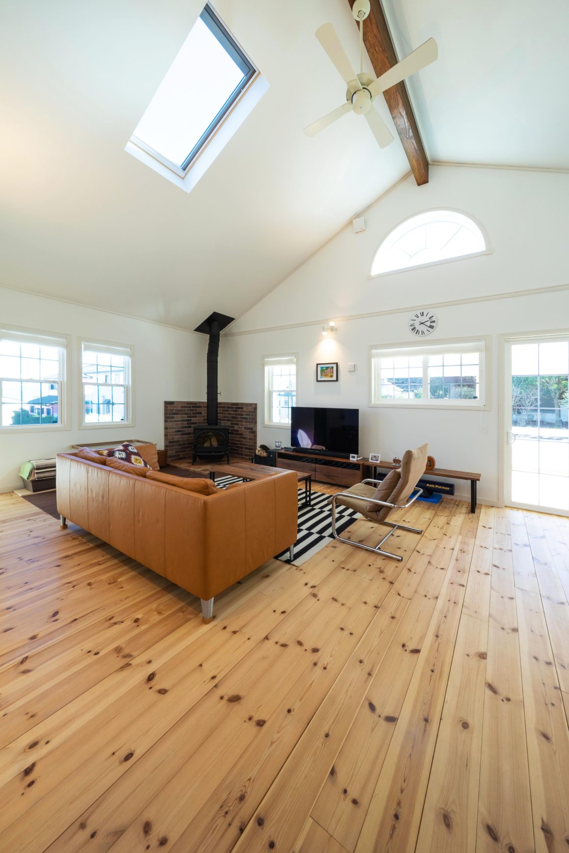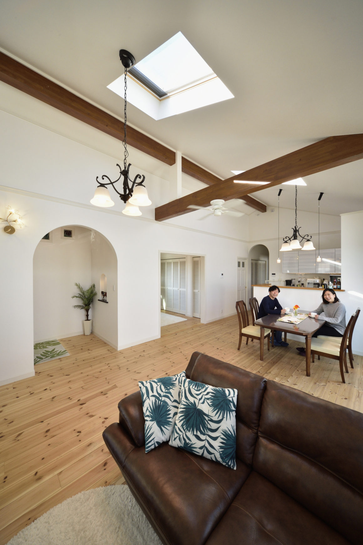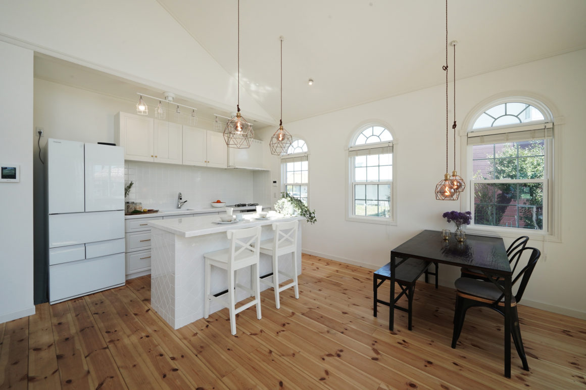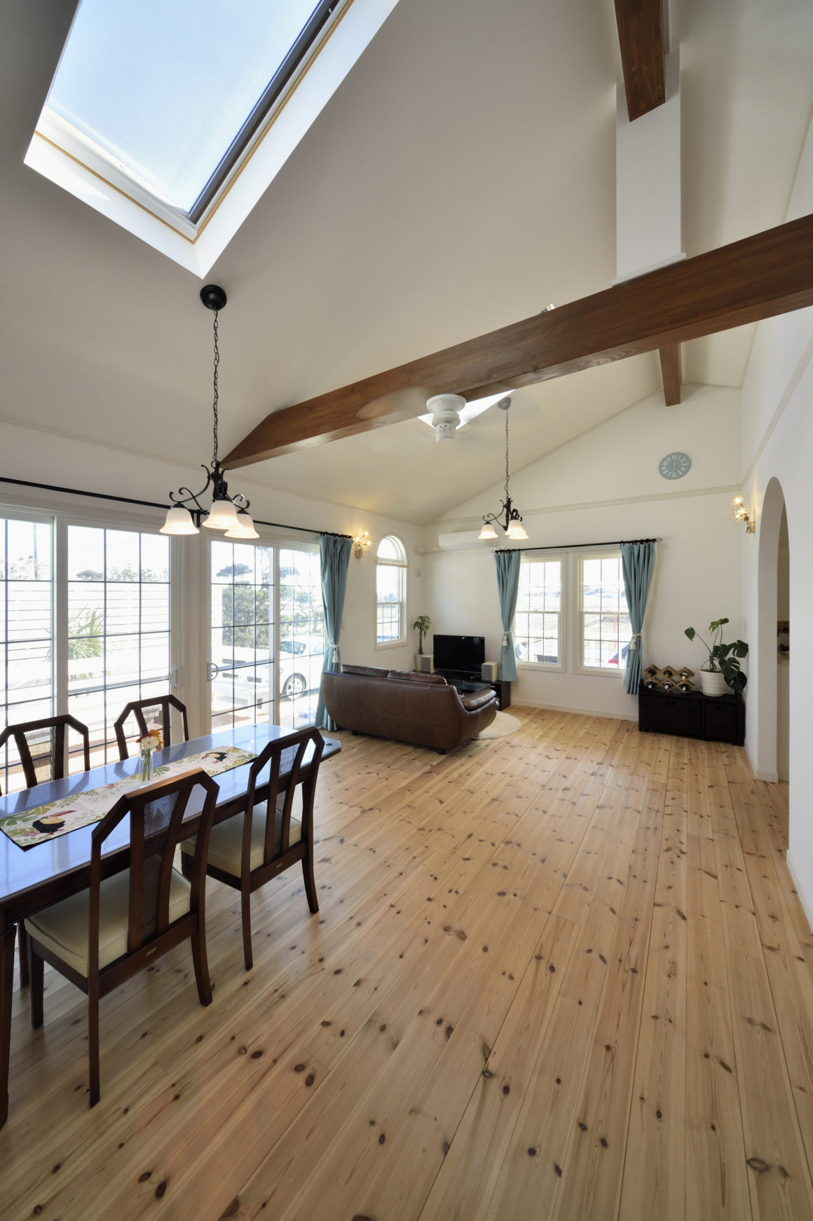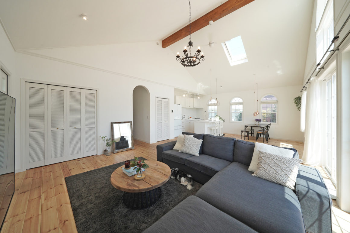 大きな勾配天井におさめられたリビング・ダイニング。広い庭の芝生は愛犬に最高のドッグラン。