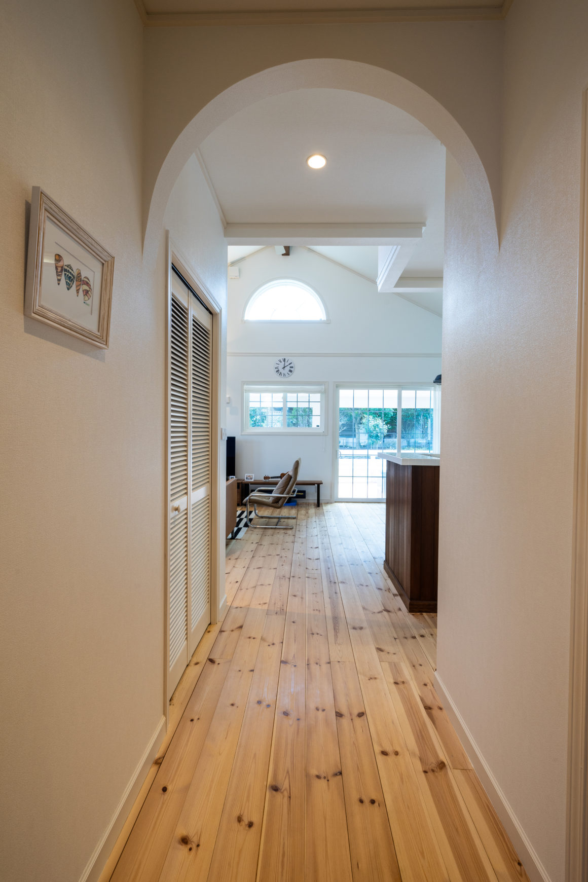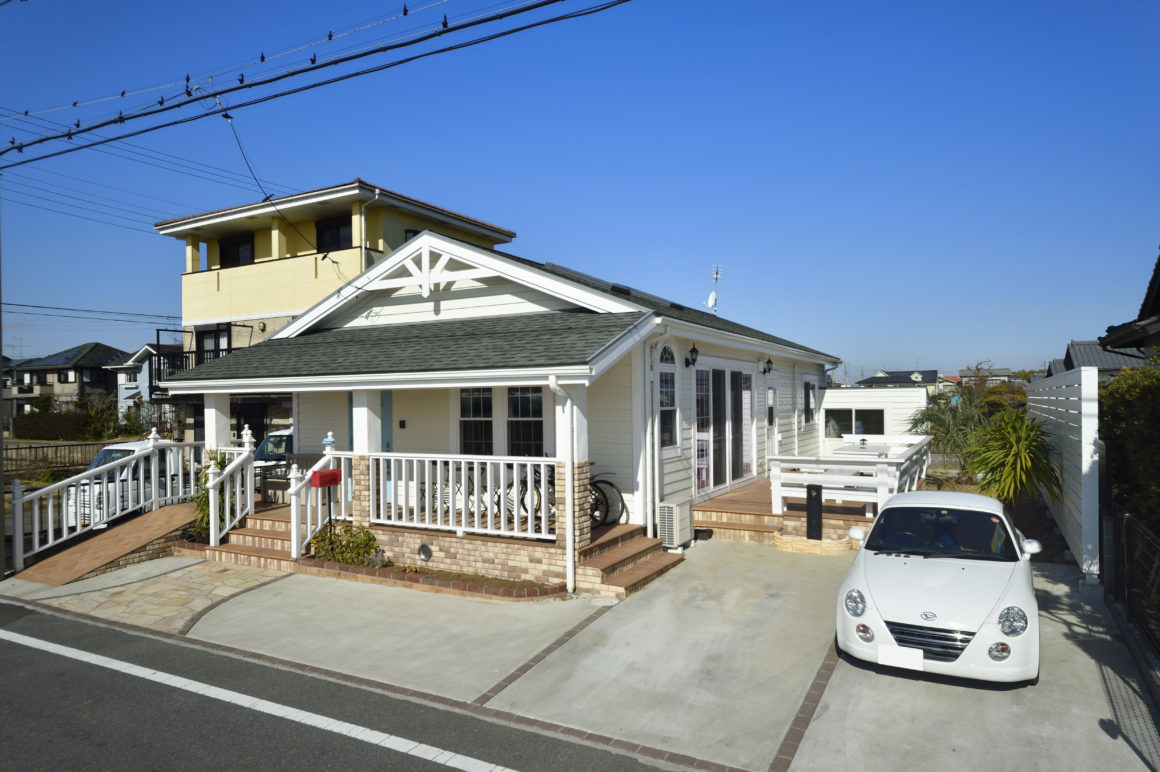 立ち並ぶ住宅の中で、ちょっと屋根の低いお家。建物はおよそ27坪。駐車スペースと大きなウッドデッキとカバードポーチを備えた平屋のM邸。都会生活から思い切って一宮移住を実行したご夫妻は迷わず「平屋は二人の存在感が近い」と話します。1階フロアで十分な生活スペースが生まれるということで日常生活者の方はもちろん、おふたりさまのご家庭や、ウイークエンドハウスとして都会とデュアルライフを楽しむ方にも好評な仕様かもしれません。