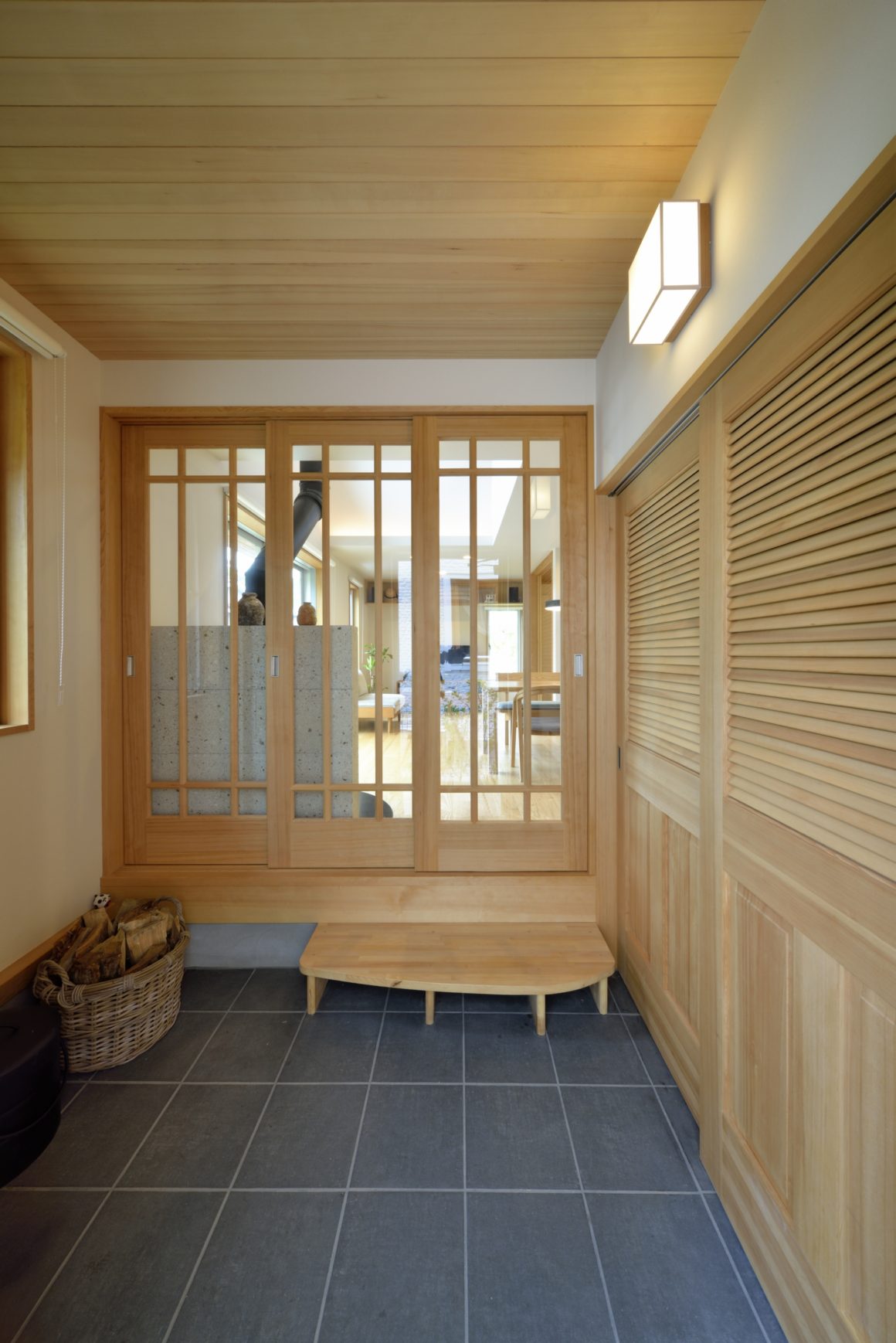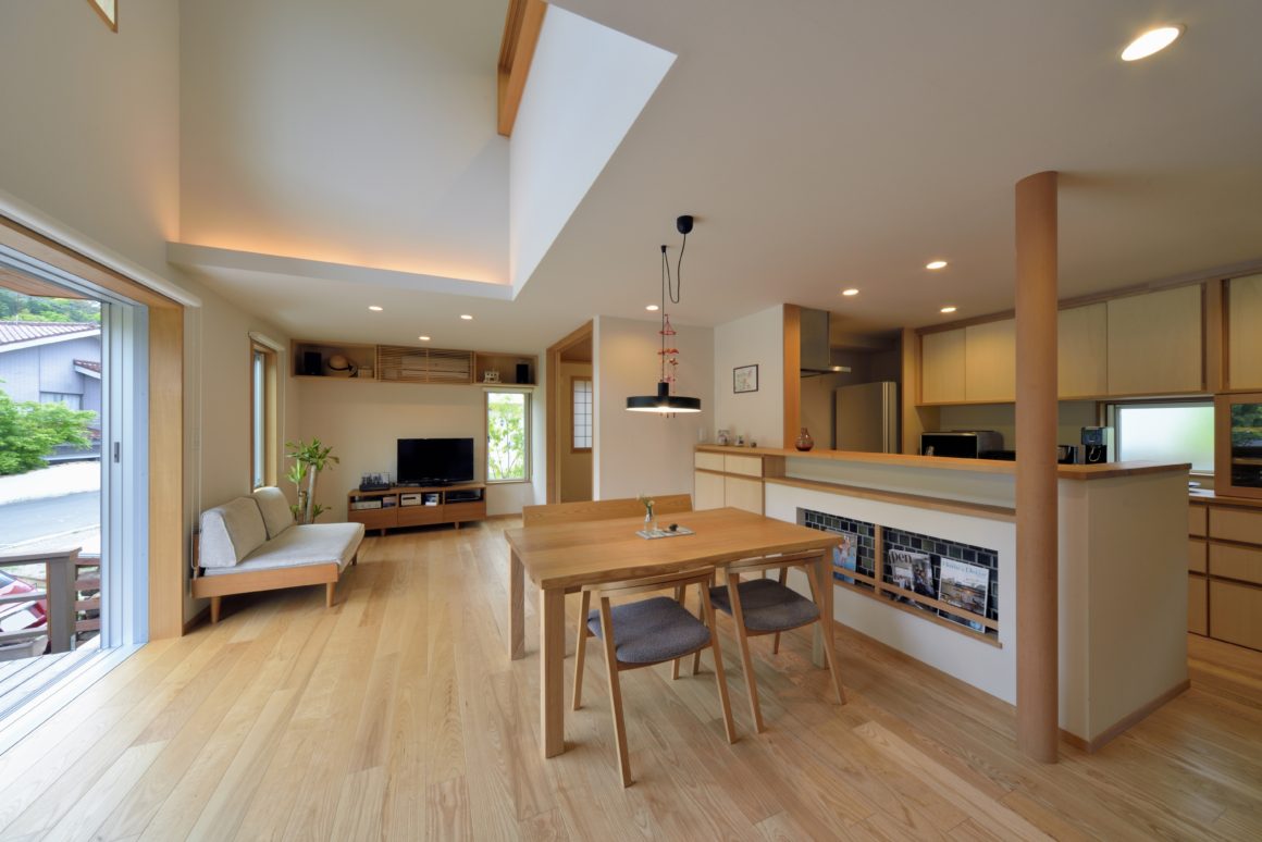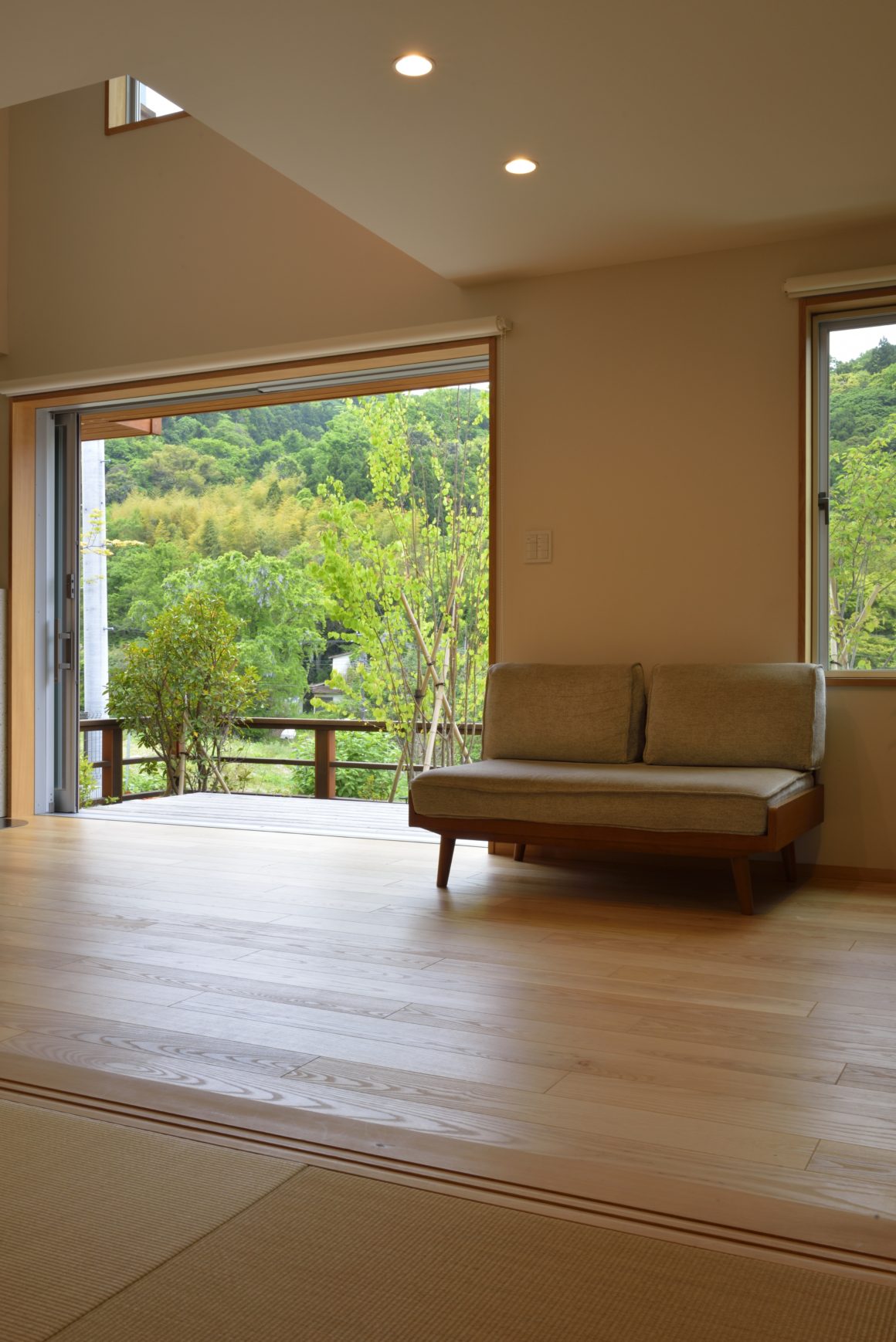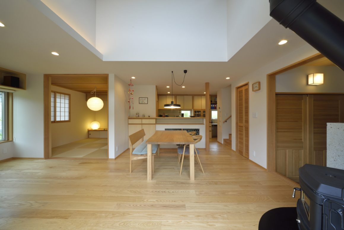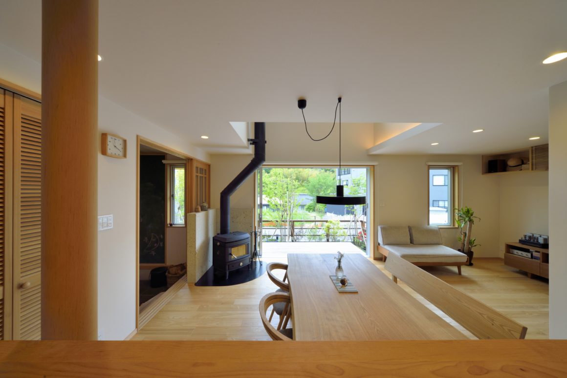 ここは緑に囲まれた静かな住宅地。望む景色はどの部屋から切り取っても素晴らしい。大開口のサッシと吹抜けの組み合わせが、景色とともに光と風を取り込む装置として絶妙に機能しています。さらに床暖房や薪ストーブを備え、四季を通して快適に暮らすための工夫が満載で、なにより肌、目に触れる素材感が心地よさを増幅させてくれます。建築家であるお施主様の志向が見事に形づくられた住まいです。
