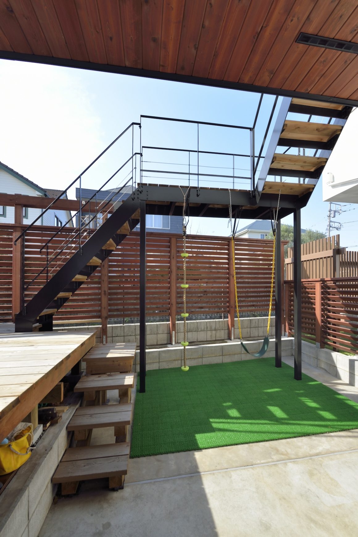 土間仕様を採用した玄関を上がれば、一階は広いリビングダイニング。なによりアウトドアリビングとなっているウッドデッキがすぐに視界に入る。ここから二階へも通じる階段をそなえていて、まるでジャングルジムのような楽しい空間ができていた。アウトドアを楽しむことが中心の暮らしをストレートに実現した住まいだ。