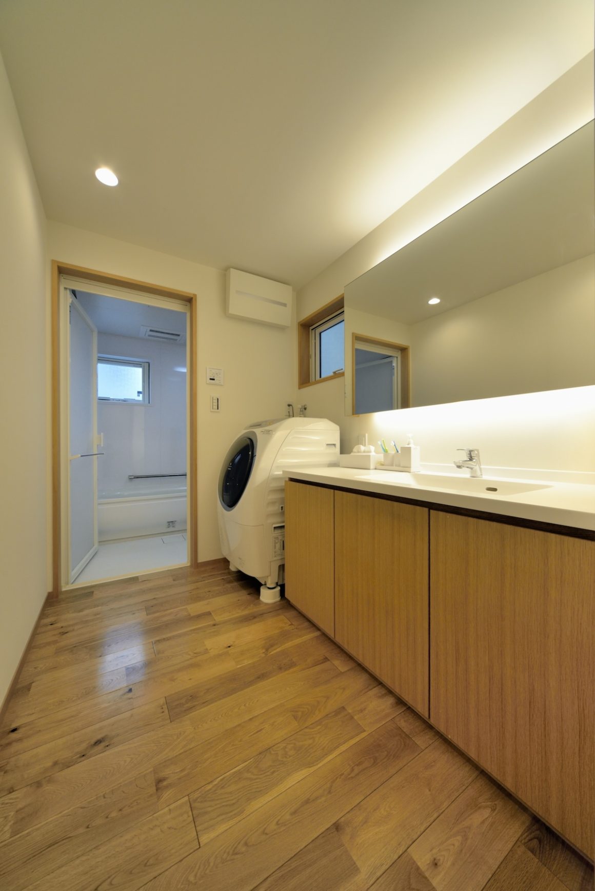 N邸の家具はほとんど専門の家具職人さんに依頼してしつらえたもの。この洗面台、カウンターデスク、ダイニングテーブル、シェルフ棚。外構の植栽もガーデン事業部が手がけたため、曰く「この家は100%キリガヤの家です」