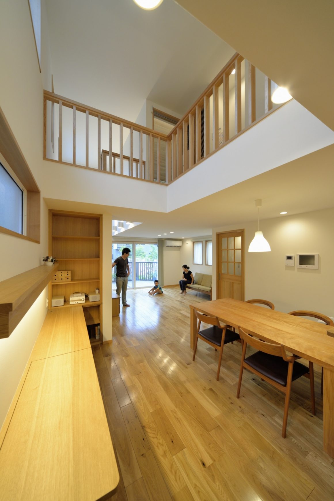 キッチンサイドからダイニング、リビング、さらにウッドデッキを望む大きな空間。ダイニング上は吹き抜けとしてさらに解放感を得る