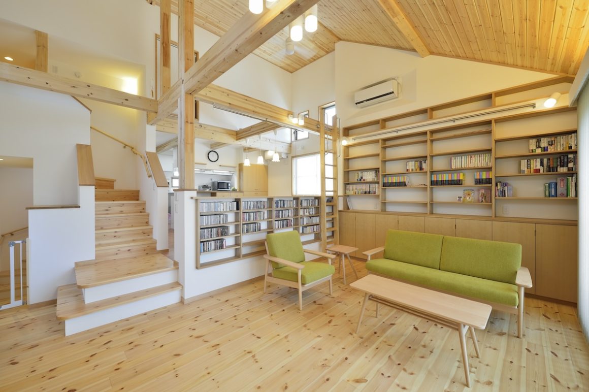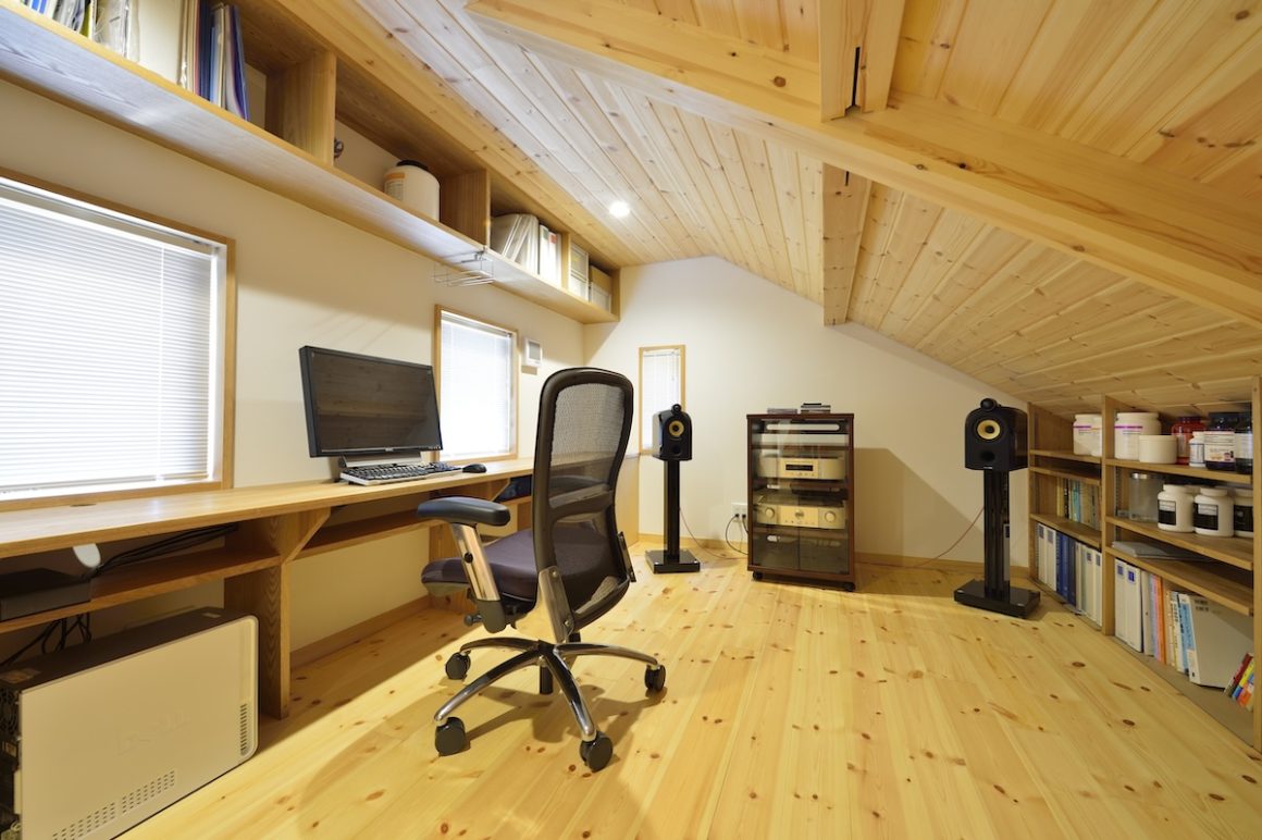1階には主賓室をメインとした居室の空間。リビングのある2階からはロフトに続くスキップフロア。また階段下など、可能なかぎり収納を確保できることですっきりと家財を整理できた。