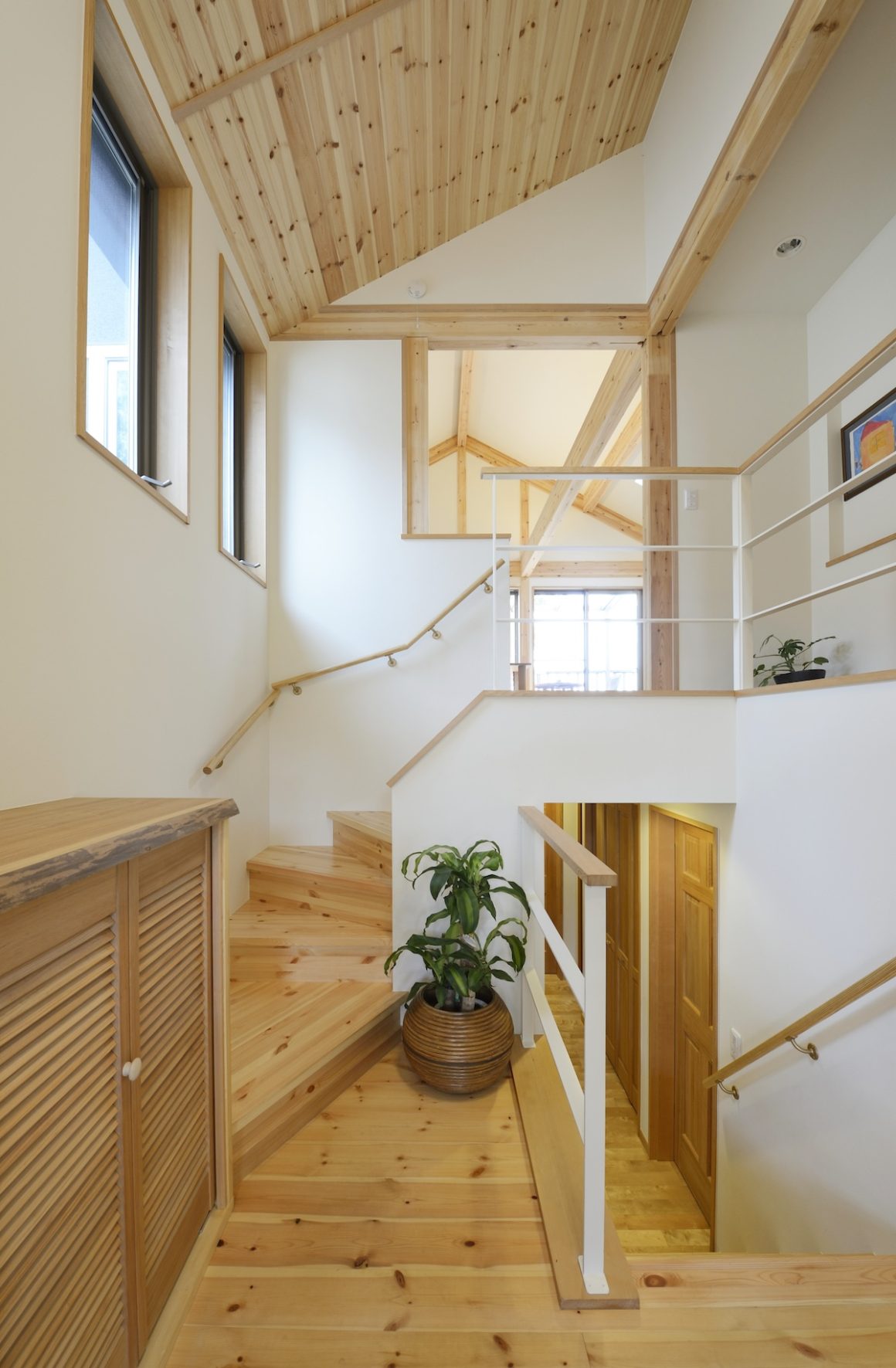 施主のK様ご家族がここに越されてまだ半年余り。しかし玄関に立った瞬間に木の香りがシャワーのように降り懸ってくるのは、そのせいだけではないはず。このふんだんに使用された木材から放たれる木の表情、香りはまちがいなく人を穏やかにしてくれます。