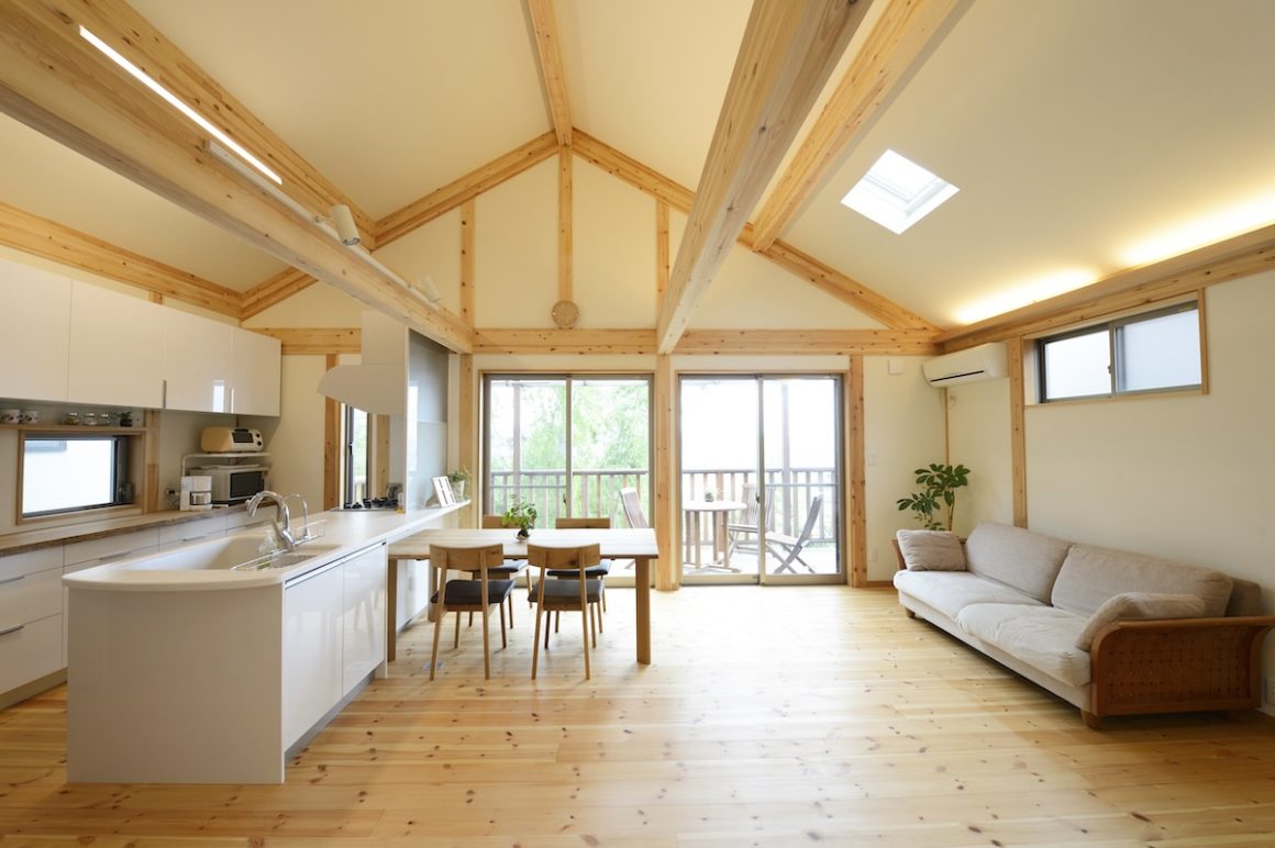 家族個々のプライベート空間は1階に集約し、2階を家族が集うリビングダイニングとしました。大きな勾配天井の大空間、太い梁。断熱対策をしっかりと施して快適な空間をクリエイトしています。