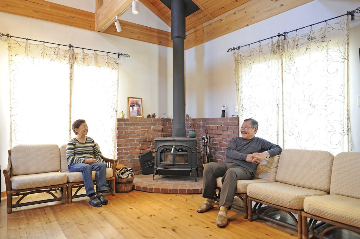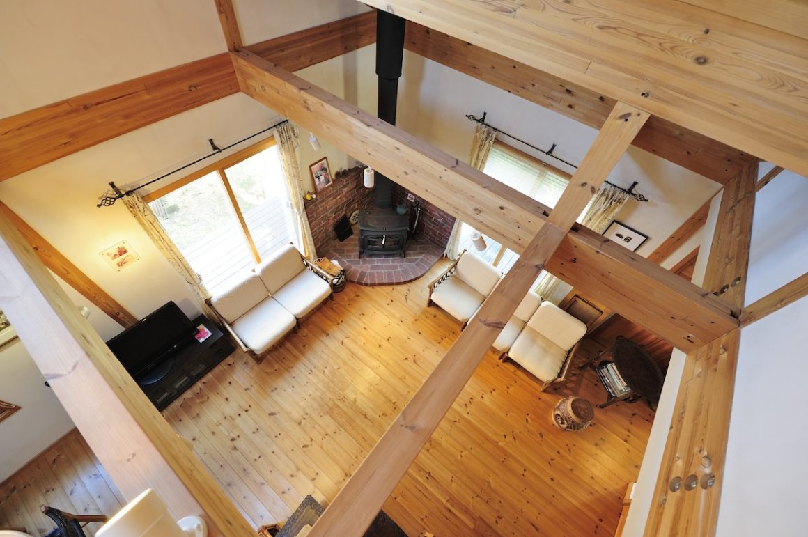 さて、1階には薪ストーブのある吹き抜けのリビングダイニング。玄関のゲストの姿も視界に入るくらいオープンな空間となっている。見上げれば大きな梁がこの家の重厚さと安心感を与えてくれる。