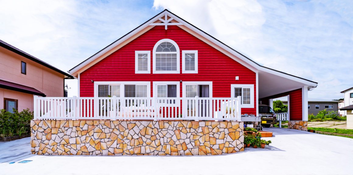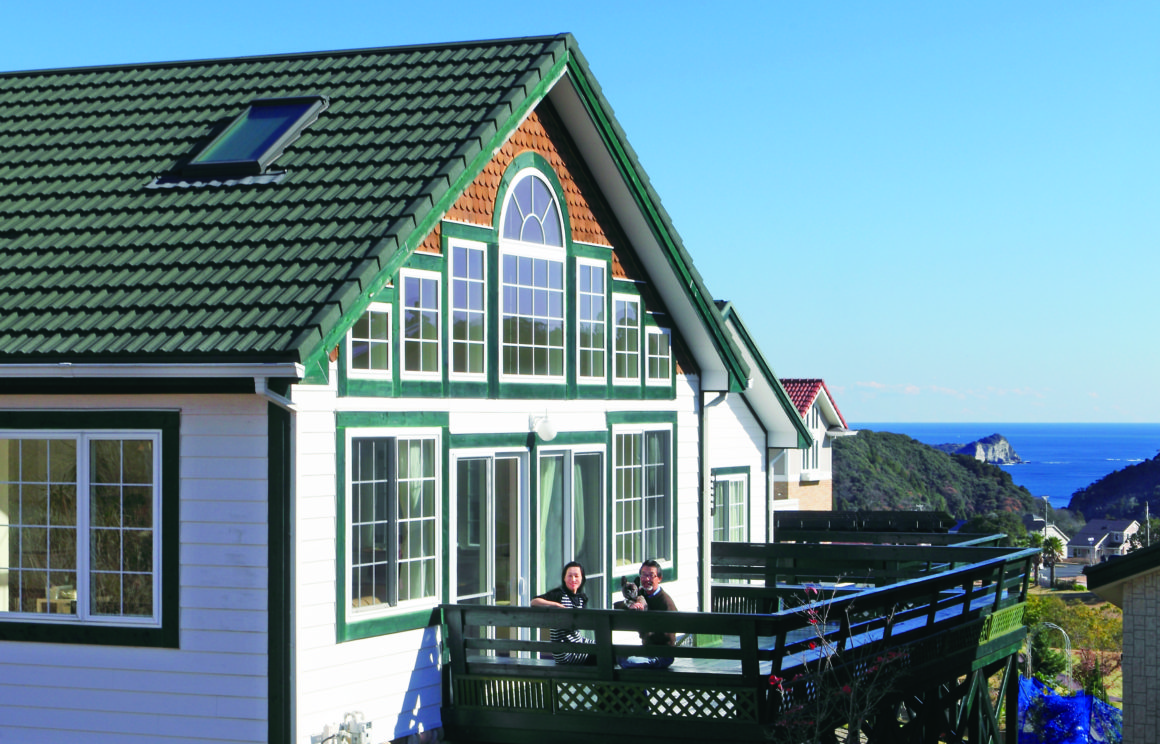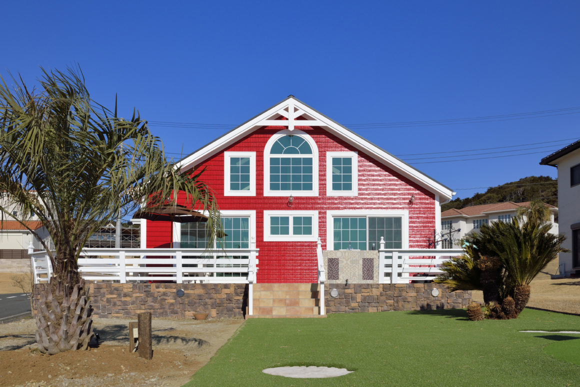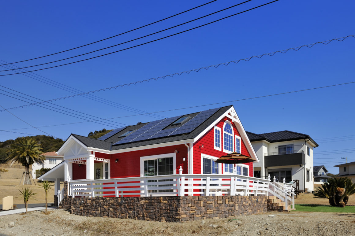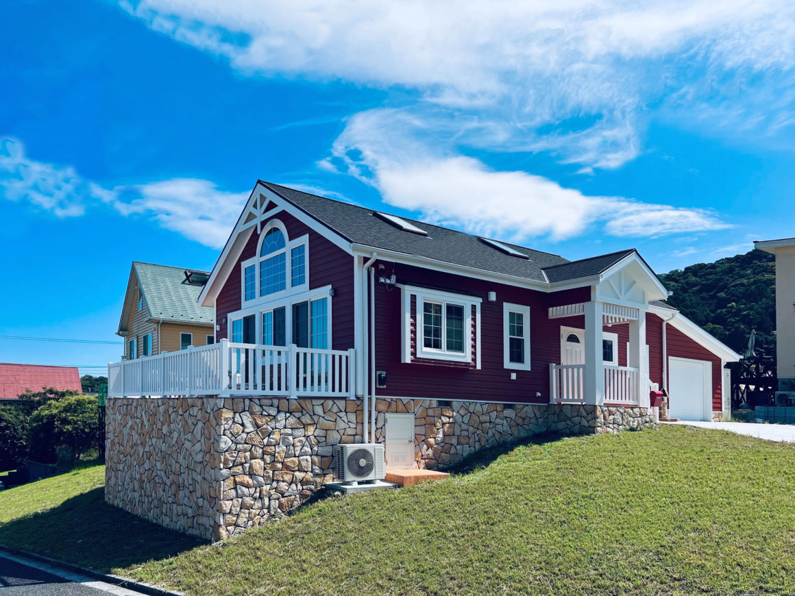 横浜市のY様は12年間を過ごした北欧生活を再現して大好きなバイクツーリングが楽しめる房総半島を移住の地として選びました。真っ赤な外壁が印象的なY邸。鉄鉱物が豊富に産出された北欧では紅殻の外壁は盛んに使われる色彩なのだそう。高台に位置するため平屋にも関わらずウッドデッキから海が望めるという移住者羨望の住環境。外房では広い土地と大きな輸入住宅が多く、ツーバイフォー+輸入住宅専門のつるおか工務店の実例を多く見ることができます。