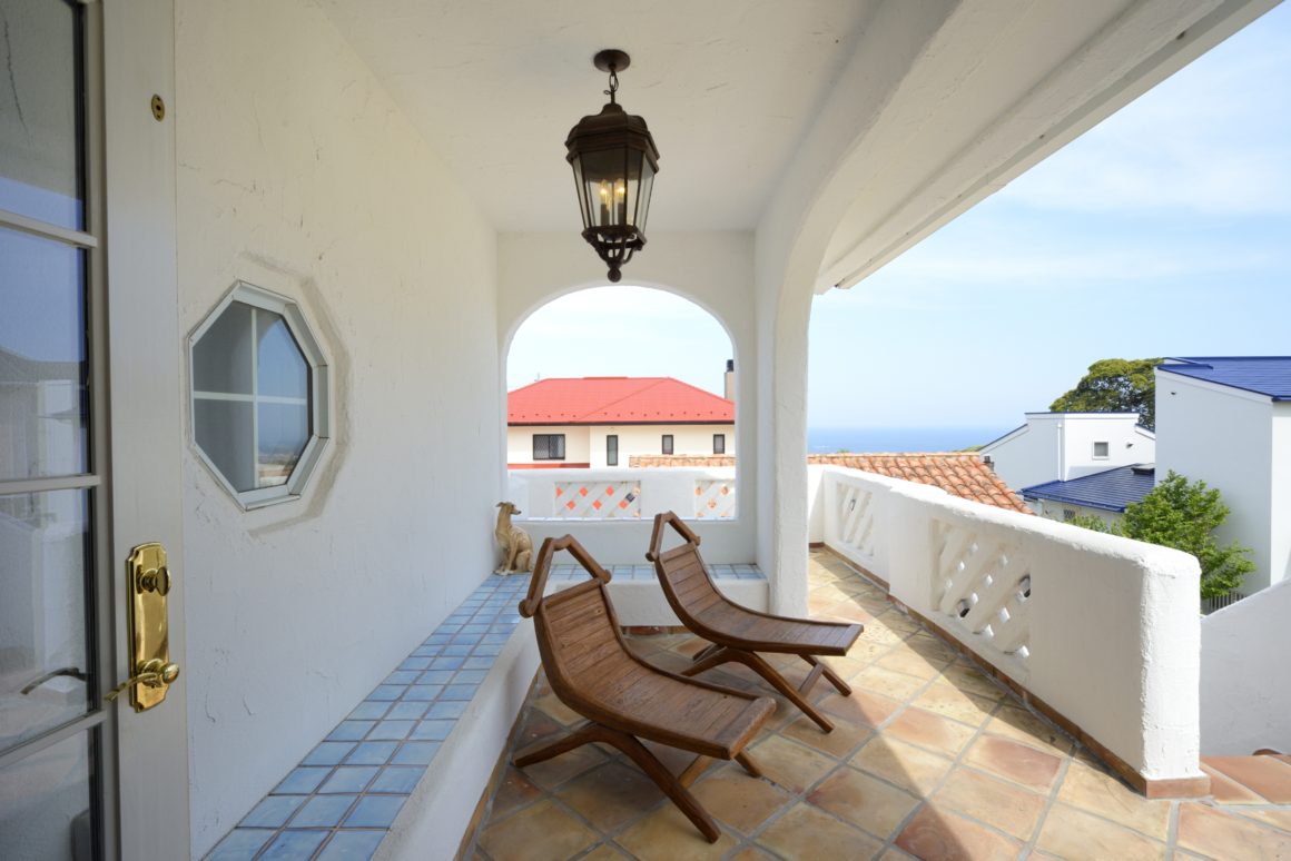 2階のテラスから木々の向こうに見える海と水平線。千葉外房のリゾート、御宿町の丘にその家は佇んでいます。区画が大きな敷地のこのリゾート住宅地でもひときわ異彩を放つM邸。施主は長いイギリスでの生活と職務経験を生かして自宅をデザイン。小さな門扉を開けた瞬間からストーリーがはじまります。アンティークな玄関扉と大きなポーチ、広い庭に続く2枚の扉、そのファサードは強くそして重厚です。