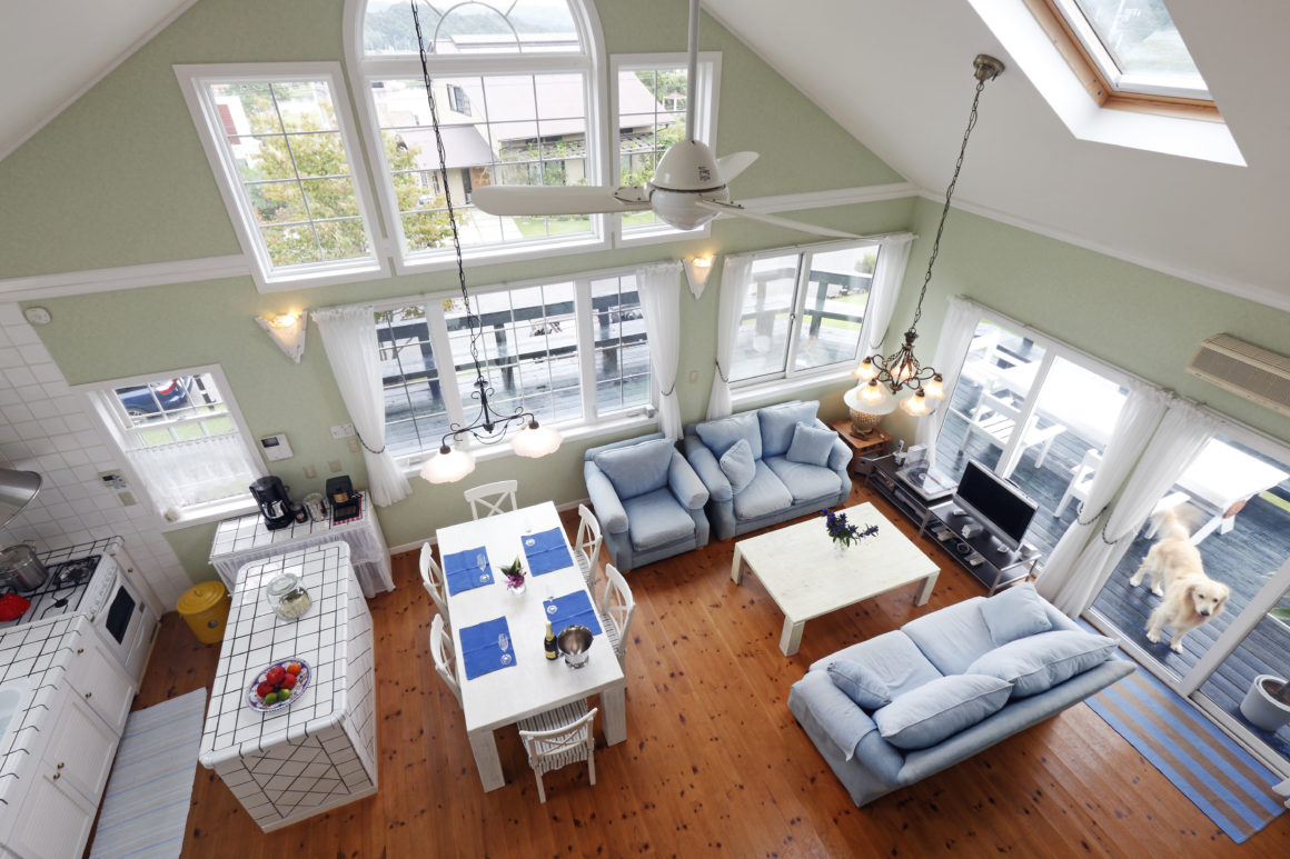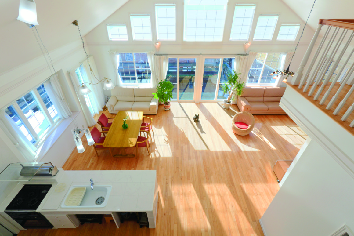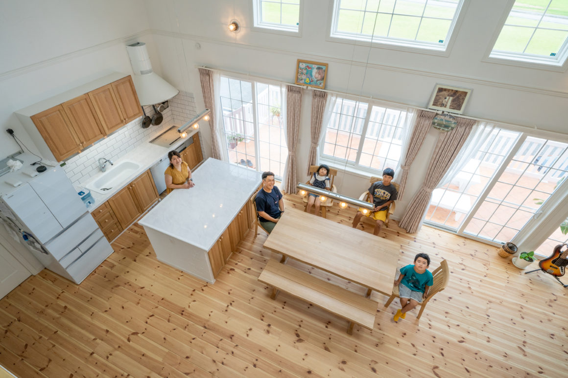 リビングドアを開けた瞬間、目の前に広がる大空間のリビング&ダイニングが魅力的なN邸。家全体の断熱性が高いからこの空間でも冬は小さなストーブ一つで暖かく過せるそうだ。ご夫婦は横浜からの移住。今ではこの恵まれた住環境のもとゴルフやテニスに興じる毎日。房総移住は「リタイアしてからでなく少し前にウイークエンドハウスとして事前に暮らしを体験してみるのが良い」と話します。