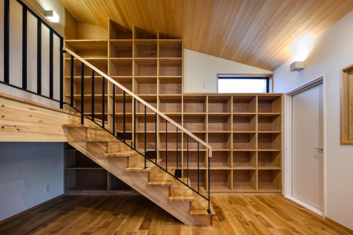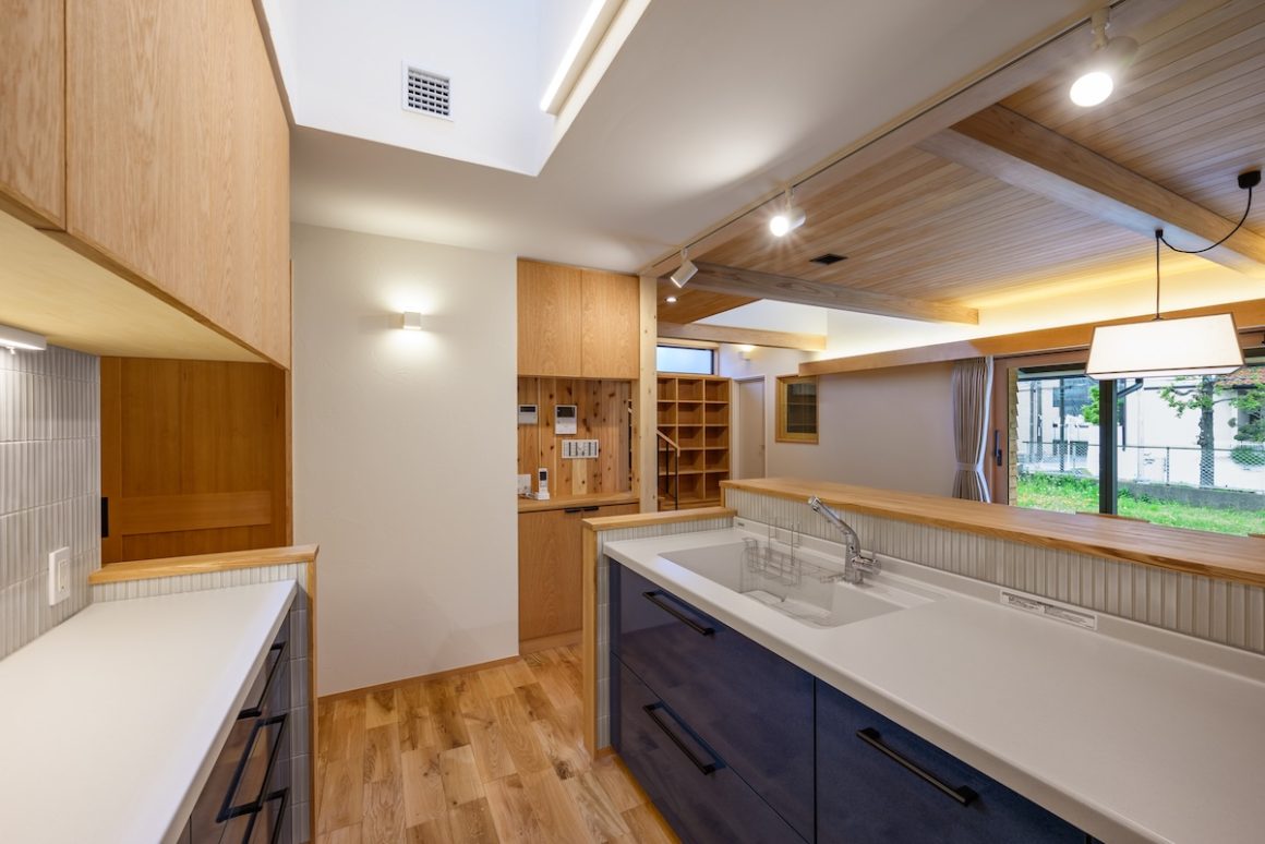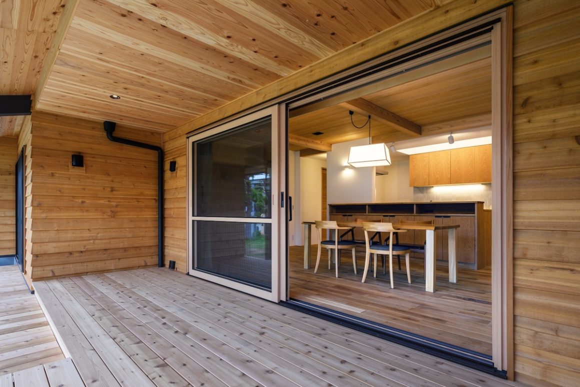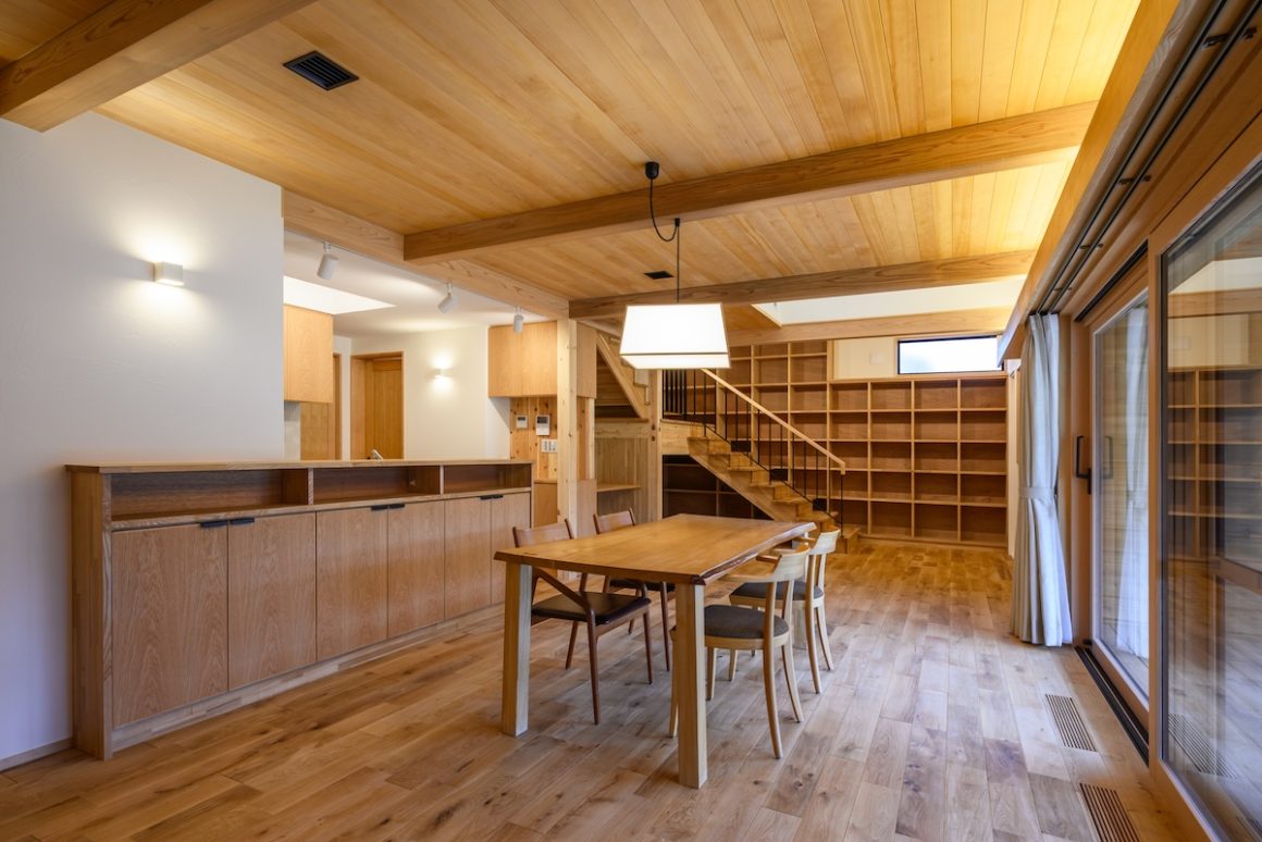 マンションや標準的な住宅が立ち並ぶ街中で、可能なかぎり木を採用したI様邸。内外観に5種類以上の木をふんだんに採用しお庭との調和が木の家本来の美しさと剛健な構えを生み出しています。