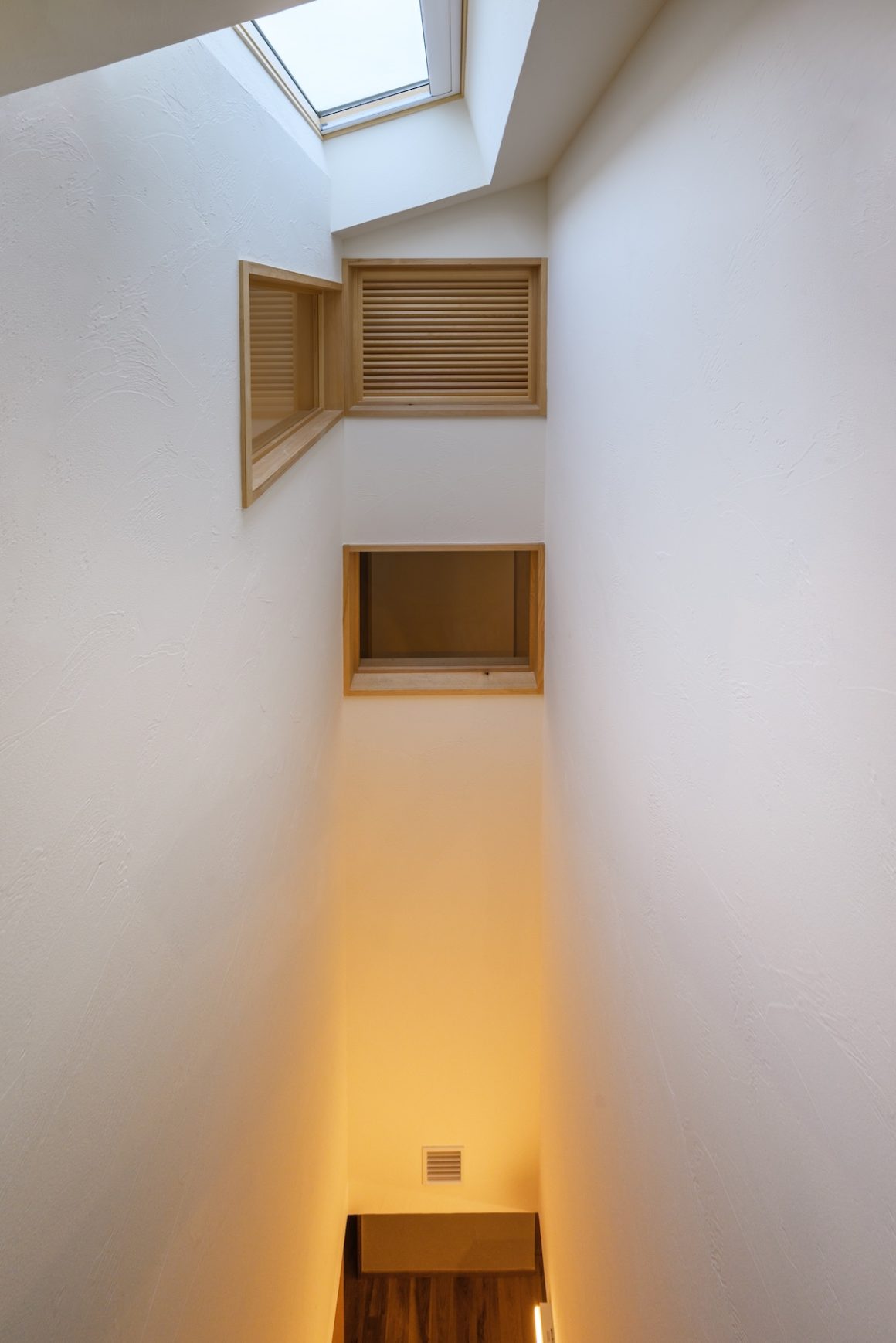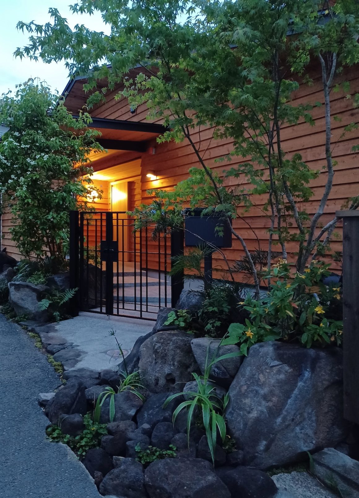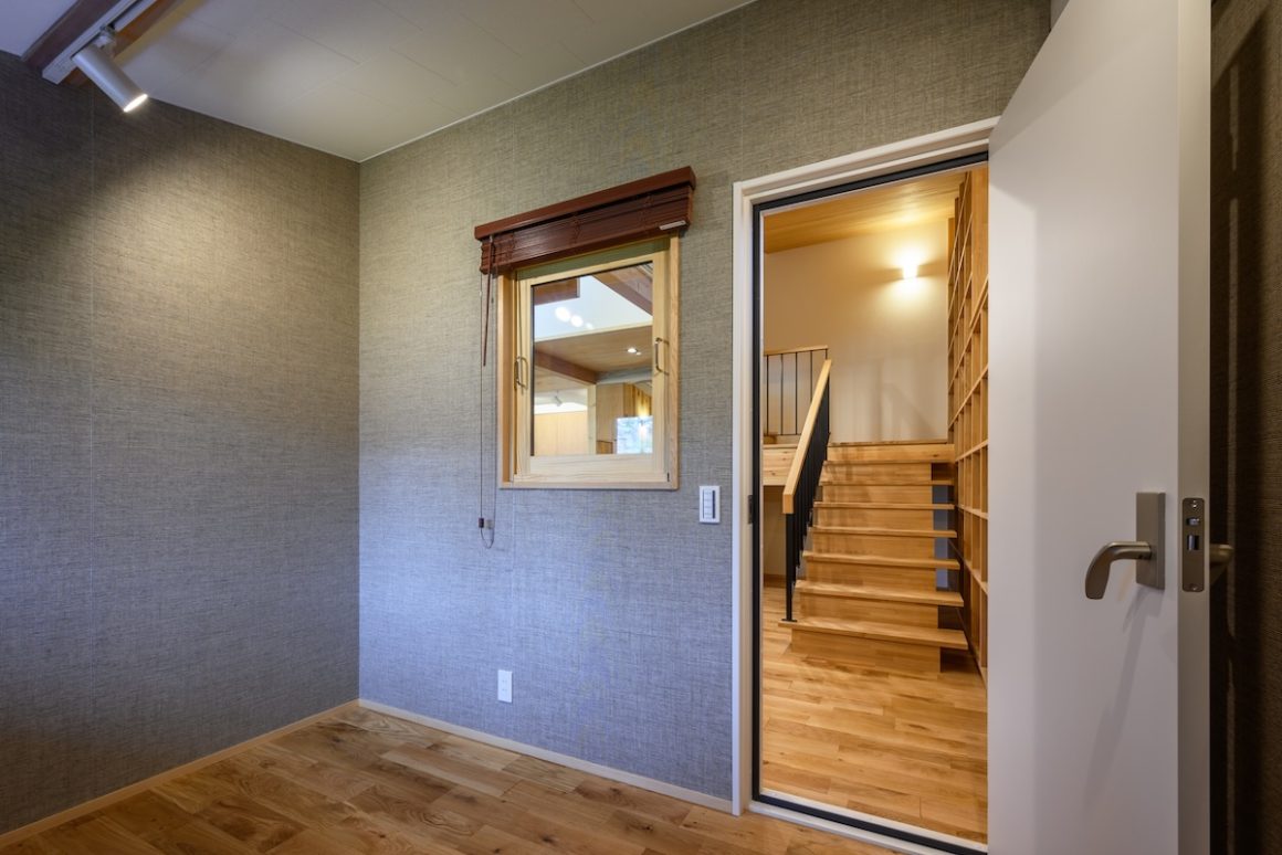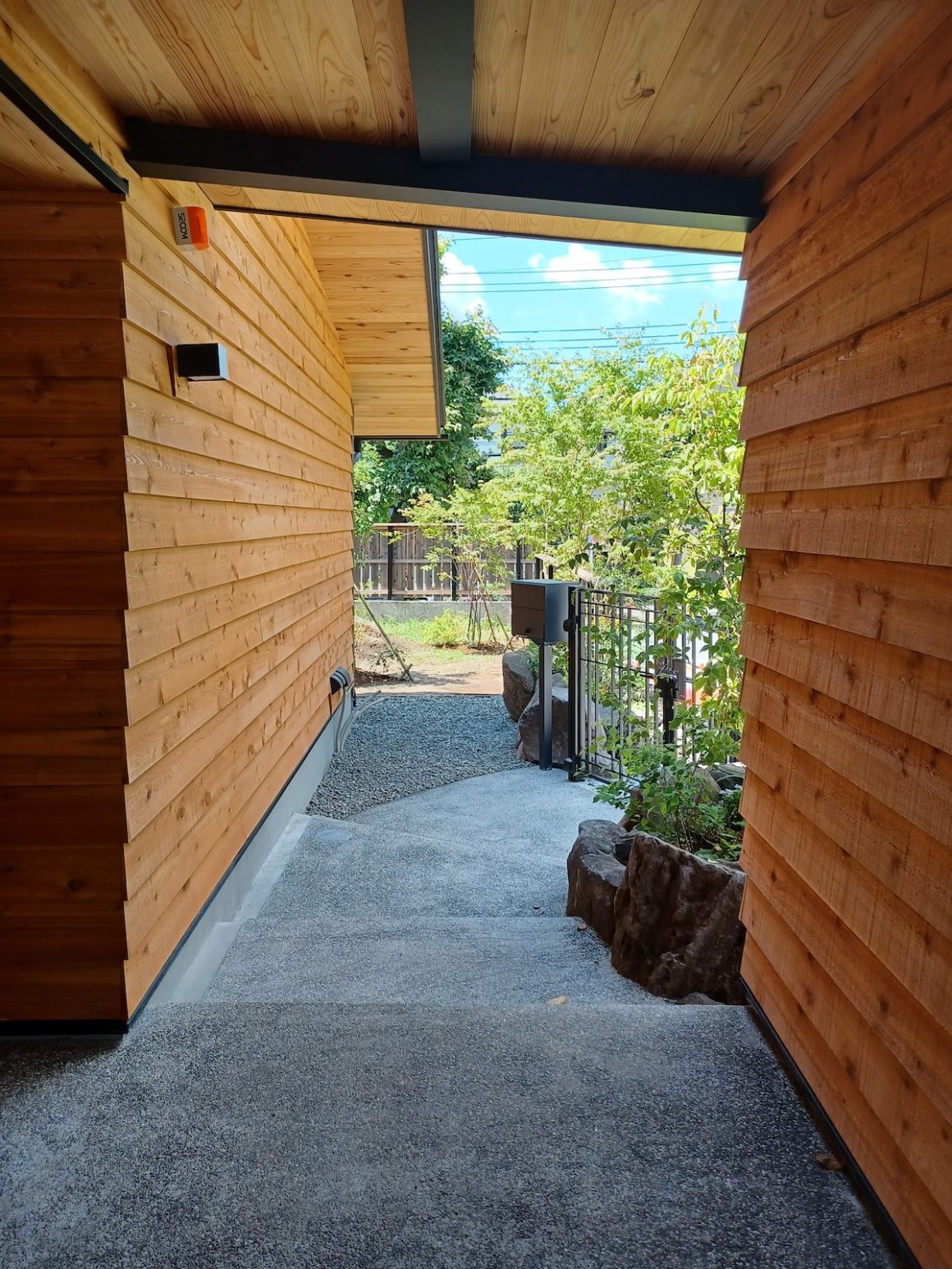 マンションや標準的な住宅が立ち並ぶ街中で、可能なかぎり木を採用したI様邸。内外観に5種類以上の木をふんだんに採用しお庭との調和が木の家本来の美しさと剛健な構えを生み出しています。