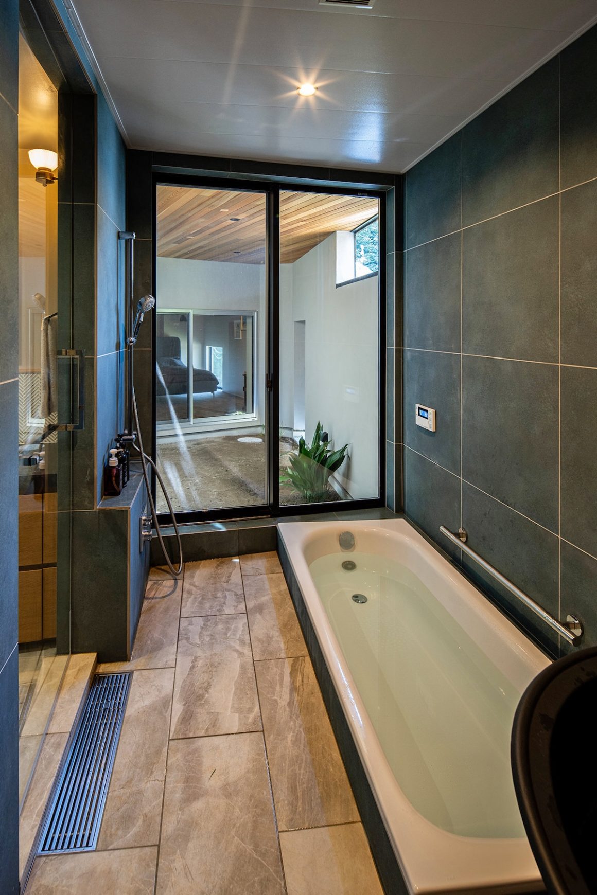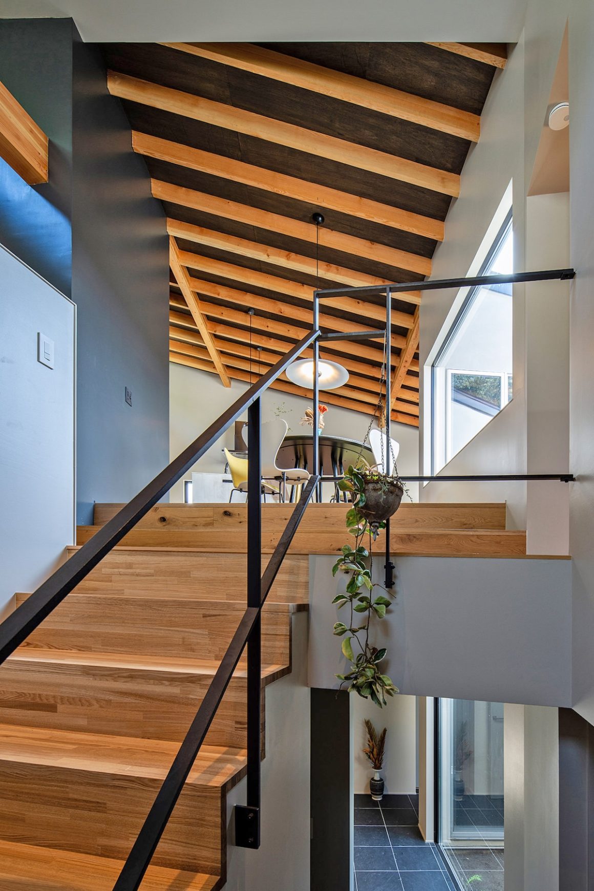 北斜面に建つ肩流れの瀟洒な外観からは、大袈裟にいえば住まい手の気持ちの強さ、前向きな「圧」のようなものを感じてしまう。アプローチをあがりエントランスの扉を開けると中庭が目に飛び込み、来訪者に大きな期待感を抱かせくれる。