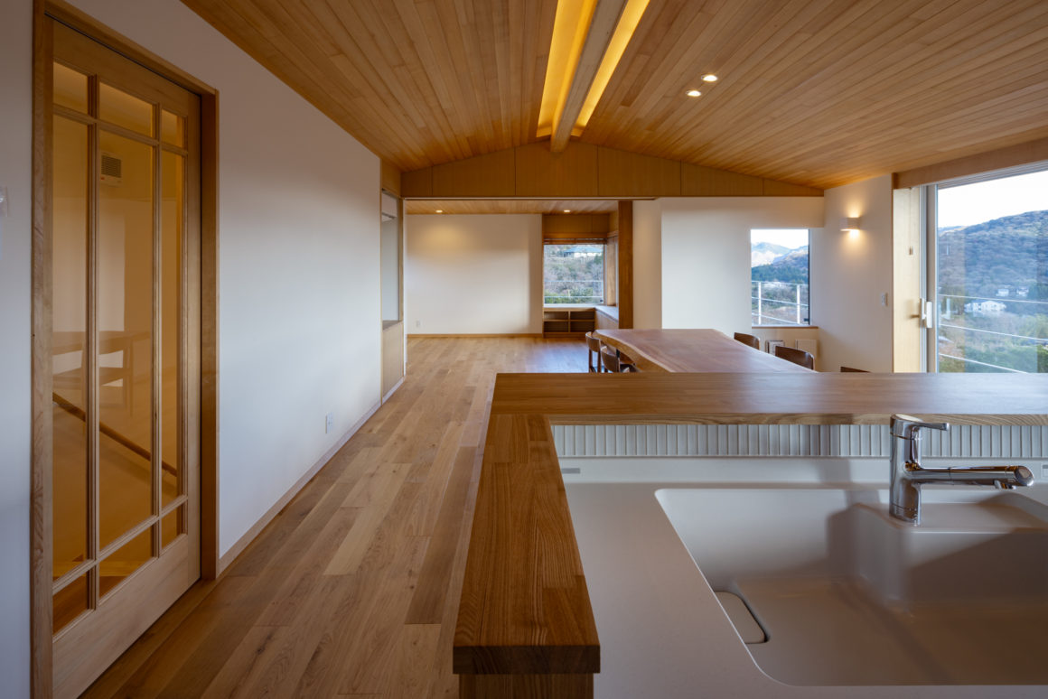 夏の避暑地として理想的な元箱根。芦ノ湖を望むその素晴らしい景観を最大限に引き出すため、設計が望んだのはSE構法による大きな室内空間と高低差がまるで宙に浮いているかのようにみえるピロティのある特別感のある建物でした。