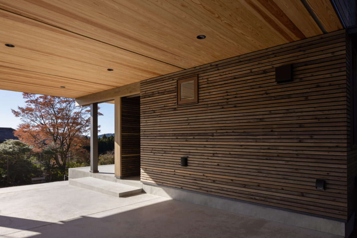 この湿気問題を解決するために採用したのが 「ファサードラタン(スノコ壁)」 です。 板張りの外壁にスノコ状の隙間を設けることで夏の日射を遮りつつ、湿気を滞留させず外に逃がす効果を狙っています。地元産のスギ材を使用することで、以下のメリットを実現しました。