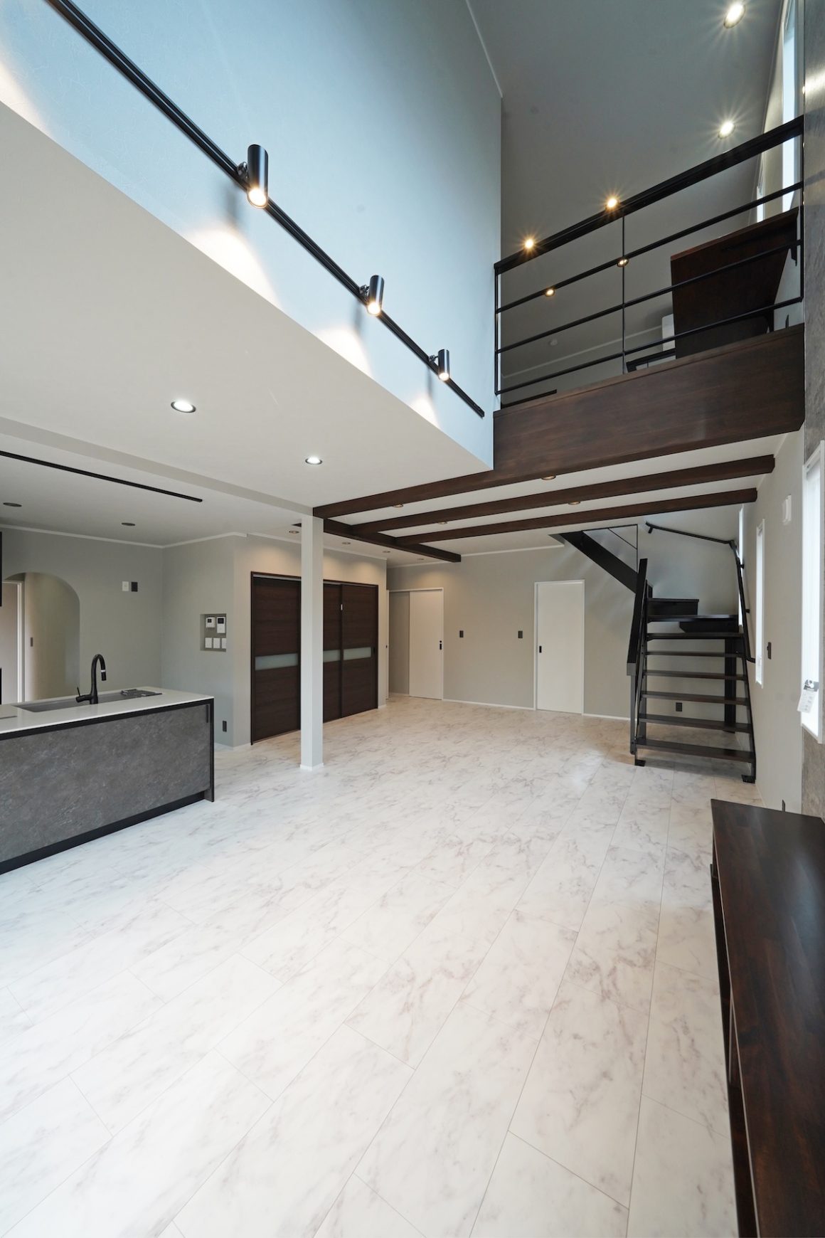 1階のリビングダイニングはおよそ30畳もの広さ。しかも大きな吹き抜けを設けているからミニホール並みの大空間となっています。延べ床面積は50坪近くあり、室内の各部屋は広々としていて、なおかつ収納が多い。お母様もご一緒に住まわれるため適度なプライバシーを保ちつつ1階はご家族みんながゆったりと過ごせる大きなスペースが魅力。