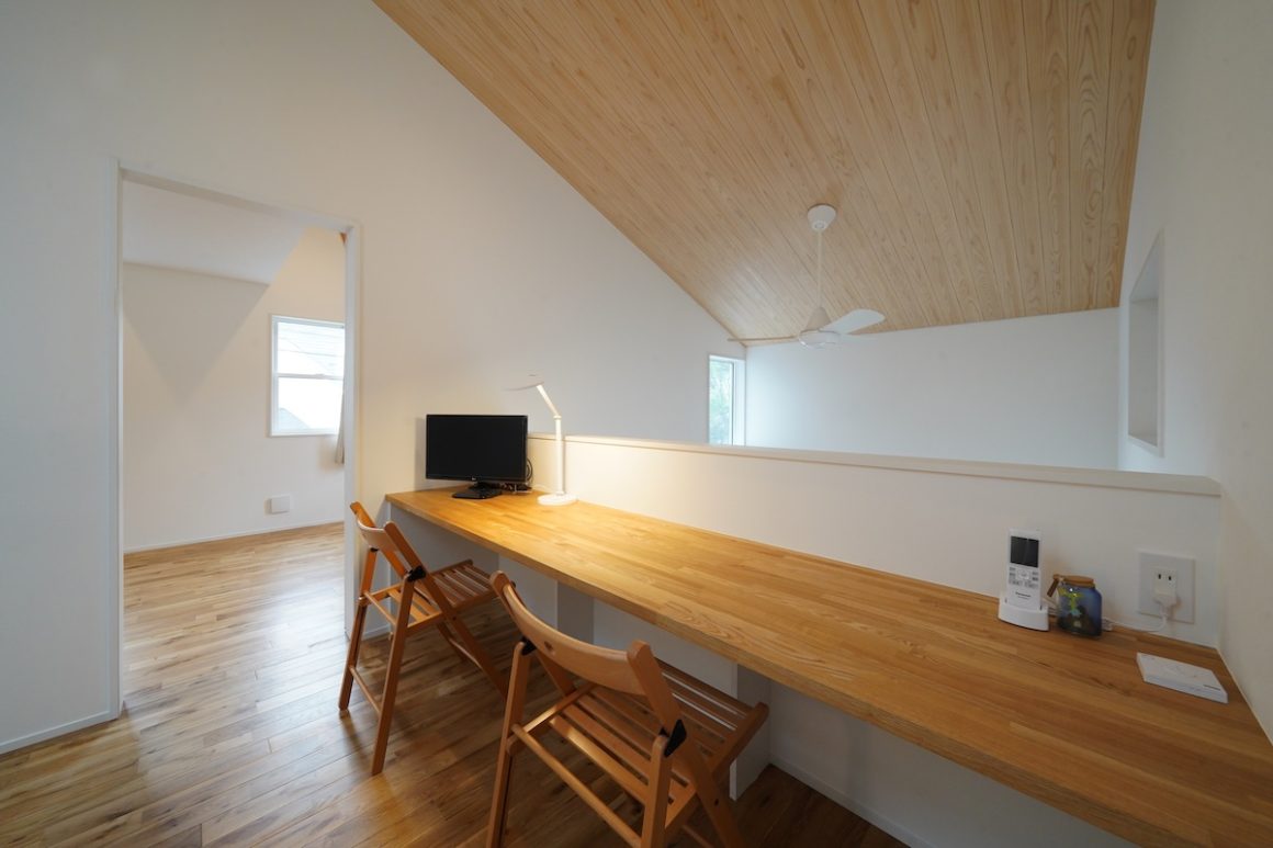 2階は大きな勾配天井の下、主寝室と将来2つの子供部屋ができる居室。そしてフリースペースには造作デスクを置いてテレワークをしながら階下でご家族の気配を感じることができます。
