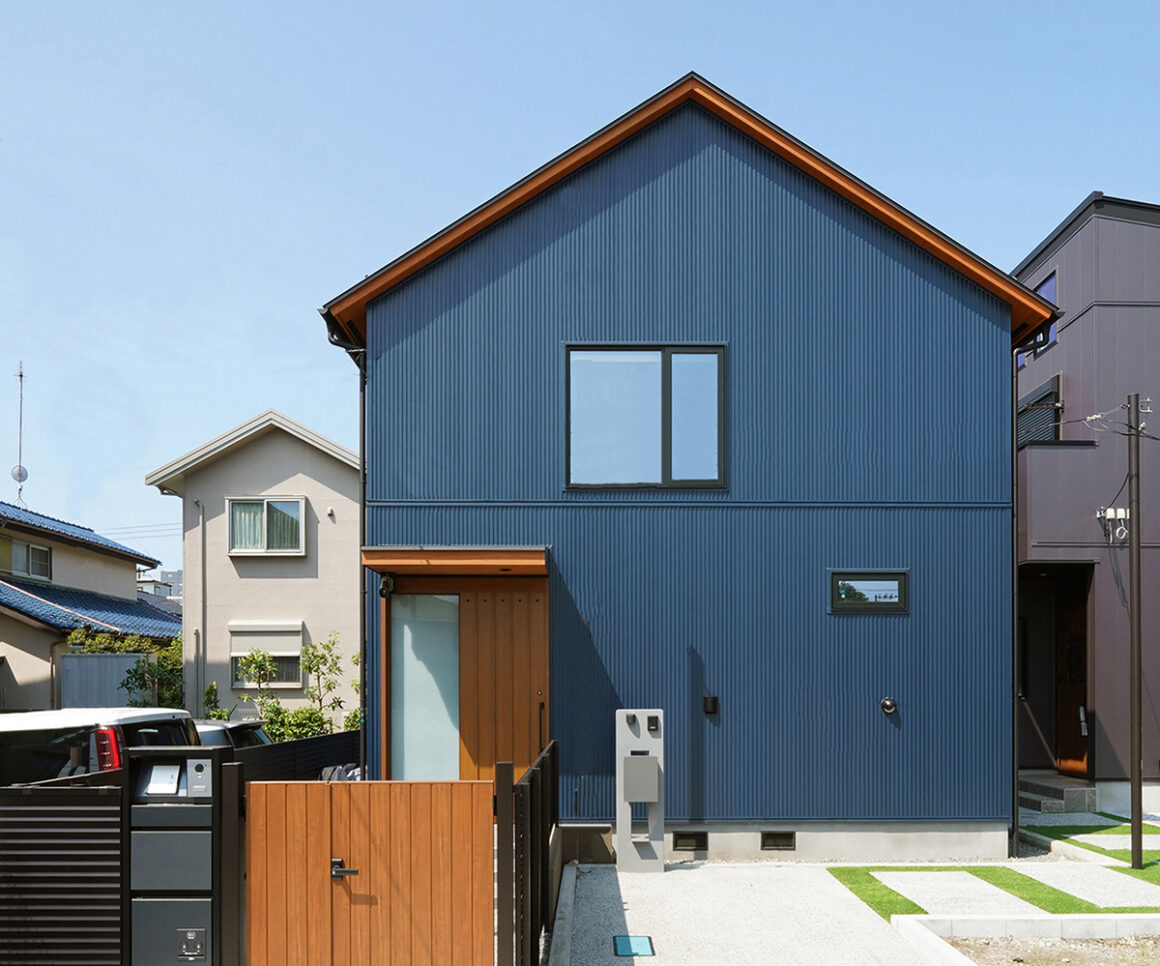 静かな住宅街でバス通りに面した敷地にO様邸はあります。シンメトリーな三角屋根、ネイビーと木目のコンビのファサードが道路側からはとても斬新で印象的。